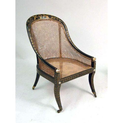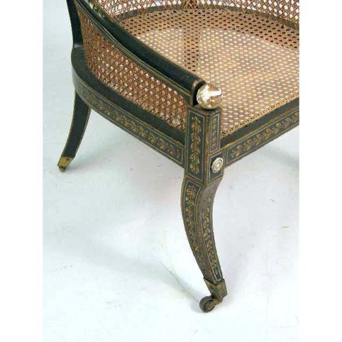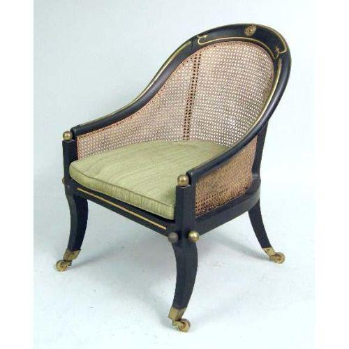 A REGENCY EBONIZED WOOD AND CANE TUB CHAIR<BR><BR>English, with incised giltwood and gilt-metal decorated, caned back and seat, caning broken on the seat. Together with a similar gilt-decorated and ebonized caned chair, 2 pieces