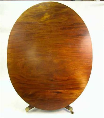 A REGENCY FIGURED MAHOGANY OVAL BREAKFAST TABLE; English, of impressive size, the tilting top above a turned standard and leaf-carved reeded legs ending in brass caps and casters (some repairs) 29"h x 4'4"w x 5'7"d