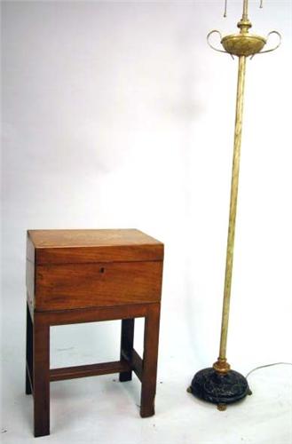 A REGENCY INLAID MAHOGANY LAP DESK-ON-STAND; English, of typical form, with secret compartment, (later inlay) 21"h x 14"w x 10"d Together with a marbleized floor lamp