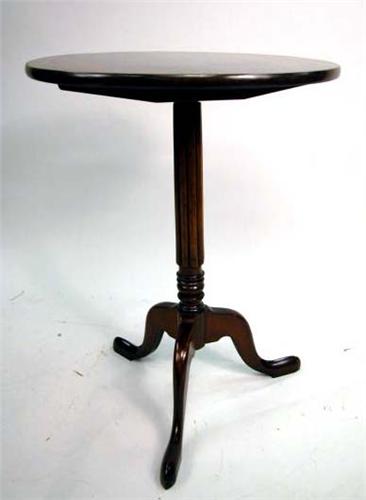 A REGENCY MAHOGANY TEA TABLE; English, with circular tilting top above a reeded standard and snake feet 29"h x 22"d (repairs)