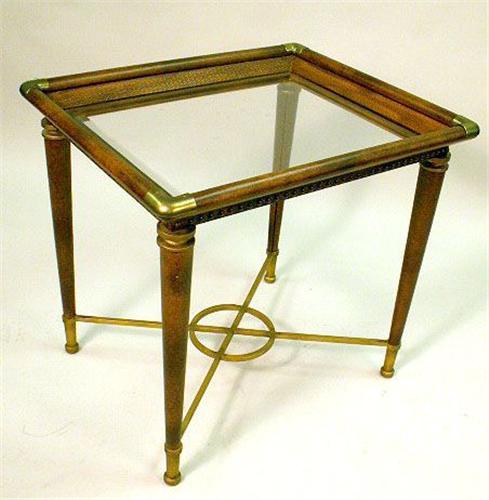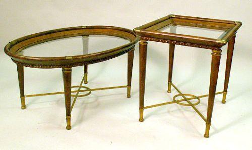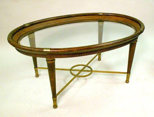 26"h x 28"w x 24"d. Together with a matching oval top cocktail table on turned tapering legs joined by gilt metal cross stretchers. 20"h x 45"w x 30"d. 2 pieces.
