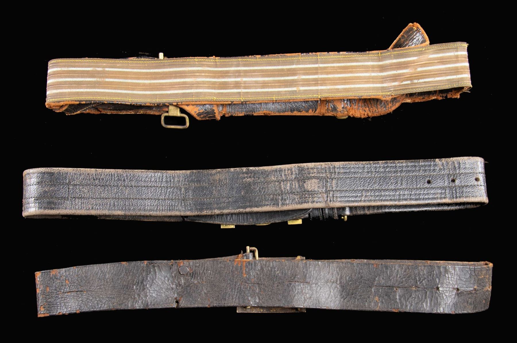 NEW YORK OFFICER'S BELTS. 1) A scarce and seldom seen Revenue Cutter Service Officer's belt and buckle. The heavily gilded faux 2-piece buckle features a horizontal anchor with an eagle in flight facing to the viewers left. The wreath and loops are heavily embellished with oak leaves and other foliate decoration. The belt is sewn reinforced black leather with the initials " P. J. S. " on the interior rear. 2) A New York junior officer's black leather service belt with a rectangular 1-piece script " N Y " buckle in brass. 3) A beautiful New York senior officer's dress uniform belt with a gold bullion face featuring 3 light blue stripes. The heavily gilded rectangular 1-piece script " N Y " buckle features a silvered wreath. CONDITION: The RCS belt and buckle show light wear. The 2 New York belts show moderate to heavy wear. (02-25129/BF). $400-600.