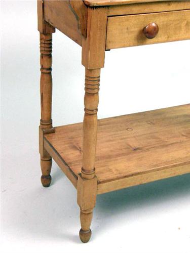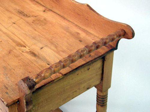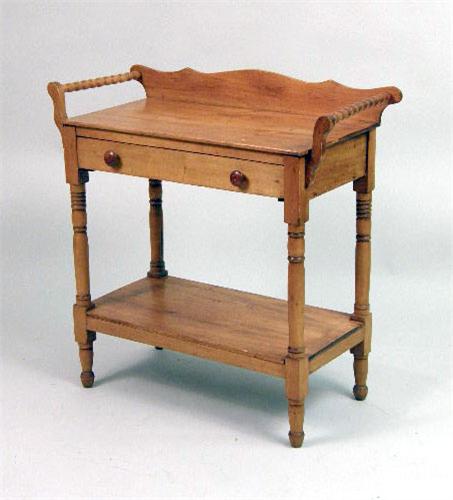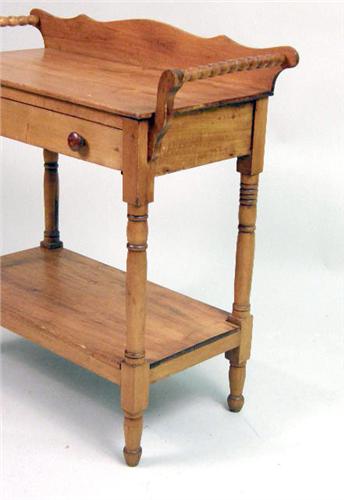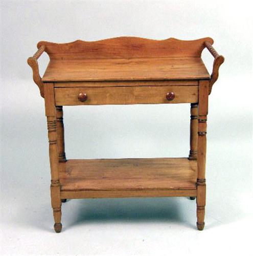 Signed in an old hand underneath the bottom shelf R. Byrne/White Plains. Byrne was an Irish immigrant to Dobbs Ferry and White Plains, New York, known to have worked with the architect Alexander Jackson Davis crafting chairs for the Lyndhurst mansion. A June 2, 1895 article from the New York Times about the village of White Plains mentions how, circa 1845, Byrne was the town cabinetmaker and part-time undertaker. 32 1/2"h x 32 1/4"w x 15 1/4"d The left-side spindle peg with an old repaired break, the right-hand spindle cracked but stable.