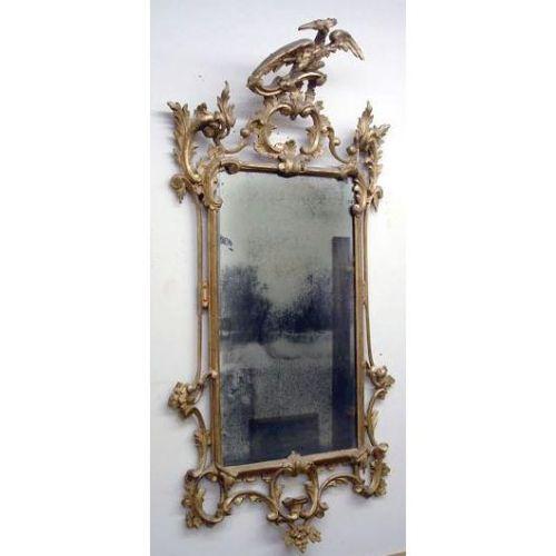 A ROCOCO CARVED PINE GILTWOOD LOOKING GLASS<BR><BR>American or English. Some repairs. 4`3"h x 26"w. Note: Microscopic analysis determined the frame is constructed of white pine. Test results are available upon request.