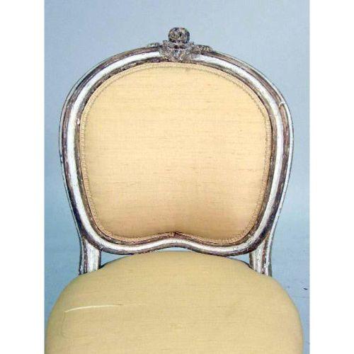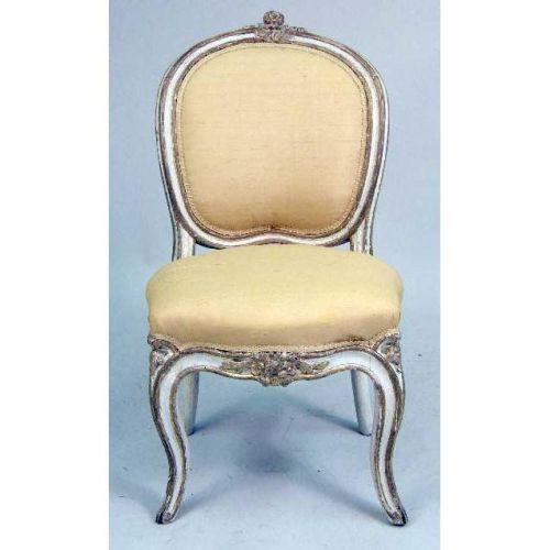 A ROCOCO PAINTED AND PARCEL-GILT SIDE CHAIR<BR><BR>With cartouche-shaped back, the top rail carved with a flowerhead, redecorated