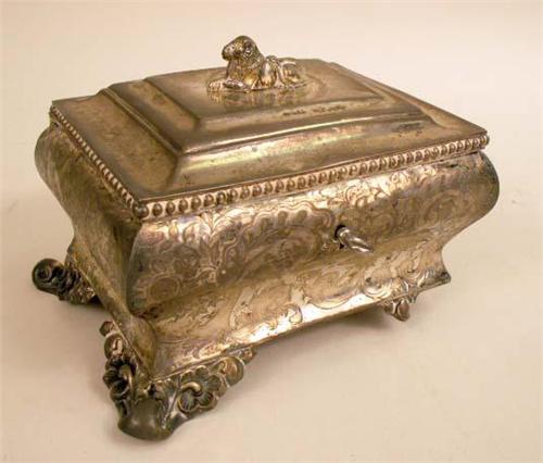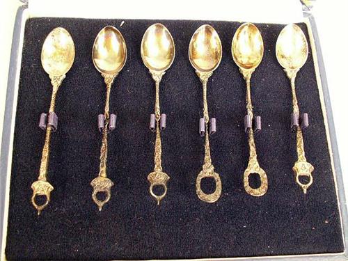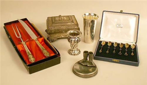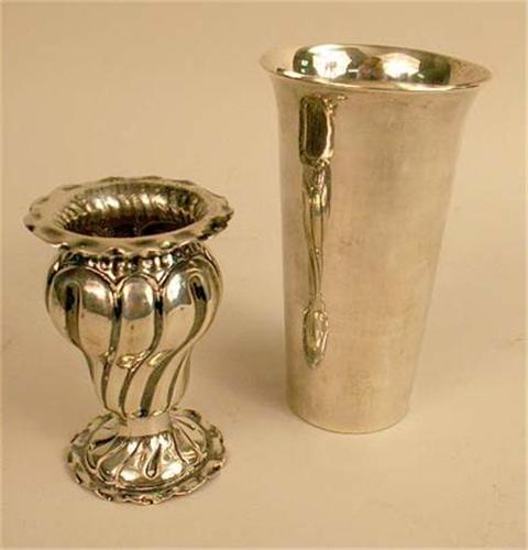 Together with a set of six Plateraci demi-tasse spoons, a Mexican silver beaker, a bud vase, and a white metal jewelry box. Losses. 11 pieces.