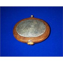 A ROOT WOOD AND SILVER SPIRIT FLASK, SCANDINAVIAN, 17th CENTURY, with applied plaques, one depicting a drinking contest, the other inscribed Morten Erich Erichsen, 1670