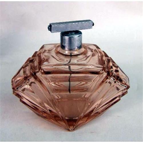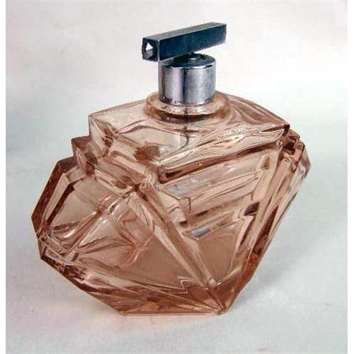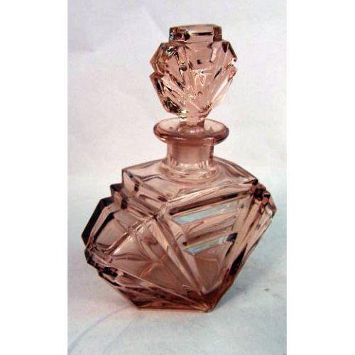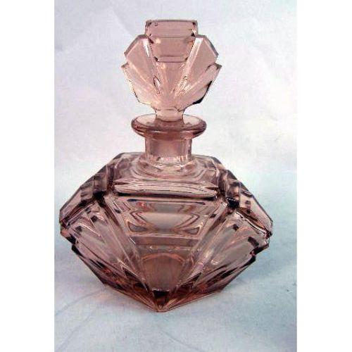 A ROSE COLORED GLASS PERFUME BOTTLE WITH STOPPER<BR><BR>Purchased in Czechoslovakia, Together with a similar atomizer, wear, 6 1/2"h