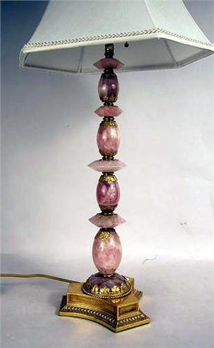 A ROSE QUARTZ AND ORMOLU-MOUNTED TABLE LAMP; Mounted on a gadrooned gilt base 30"h