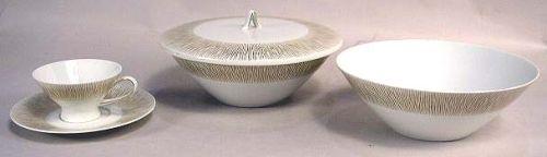 A ROSENTHAL, GERMANY PORCELAIN PARTIAL DINNER SERVICE; Cream background with gold sun-burst design, comprising: 10 luncheon plates, 2 dinner plates, 12 bread & butter plates, 12 bouillon cups with underplates, 18 dessert/salad plates, 16 coffee cups with 17 saucers, 2 platters, and 2 serving bowls, one with a cover