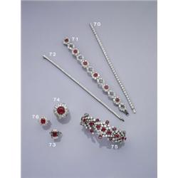 The lozenge shaped cluster centre set with brilliant and baguette-cut diamonds, accented with oval shaped rubies, to a similarly set graduated bracelet of chevron link design.