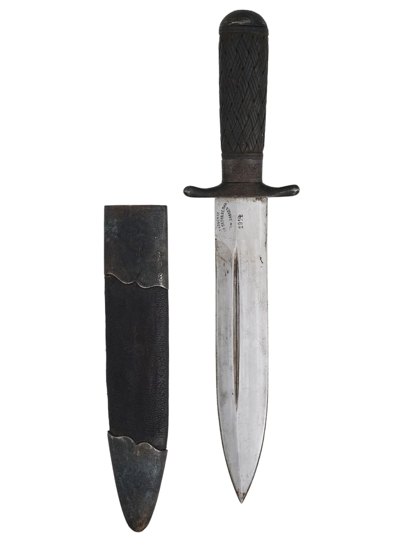 With a double-edged tapering blade with one groove on both sides. Carved wooden grip with a steel pommel. The scabbard is made of leather with steel mounts. The blade is marked by Tula Manufacturer and is dated 1914. The knife is in good condition overall. The blade shows minor scratches.