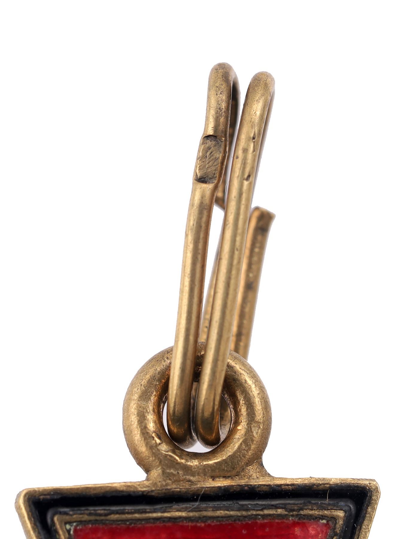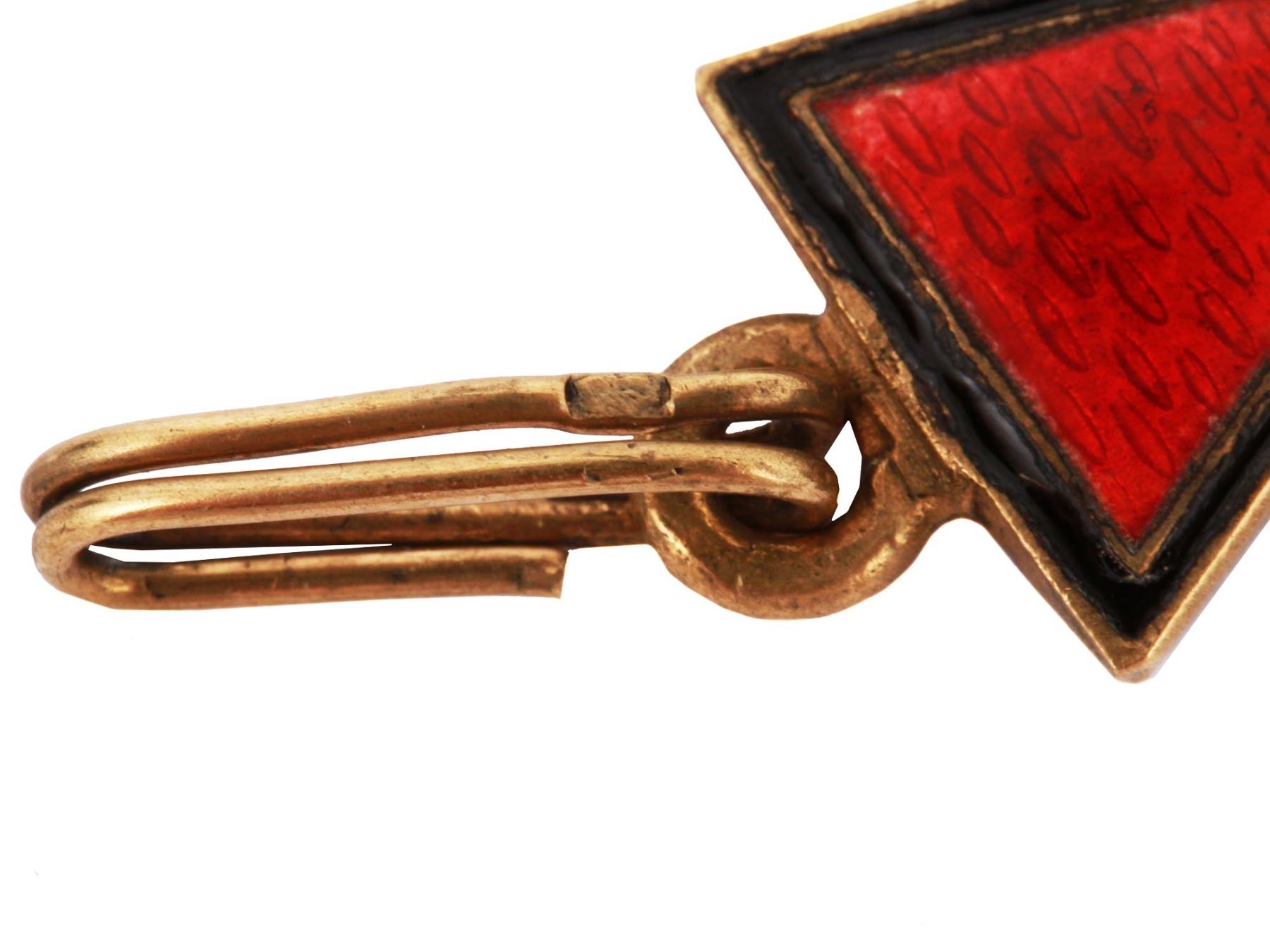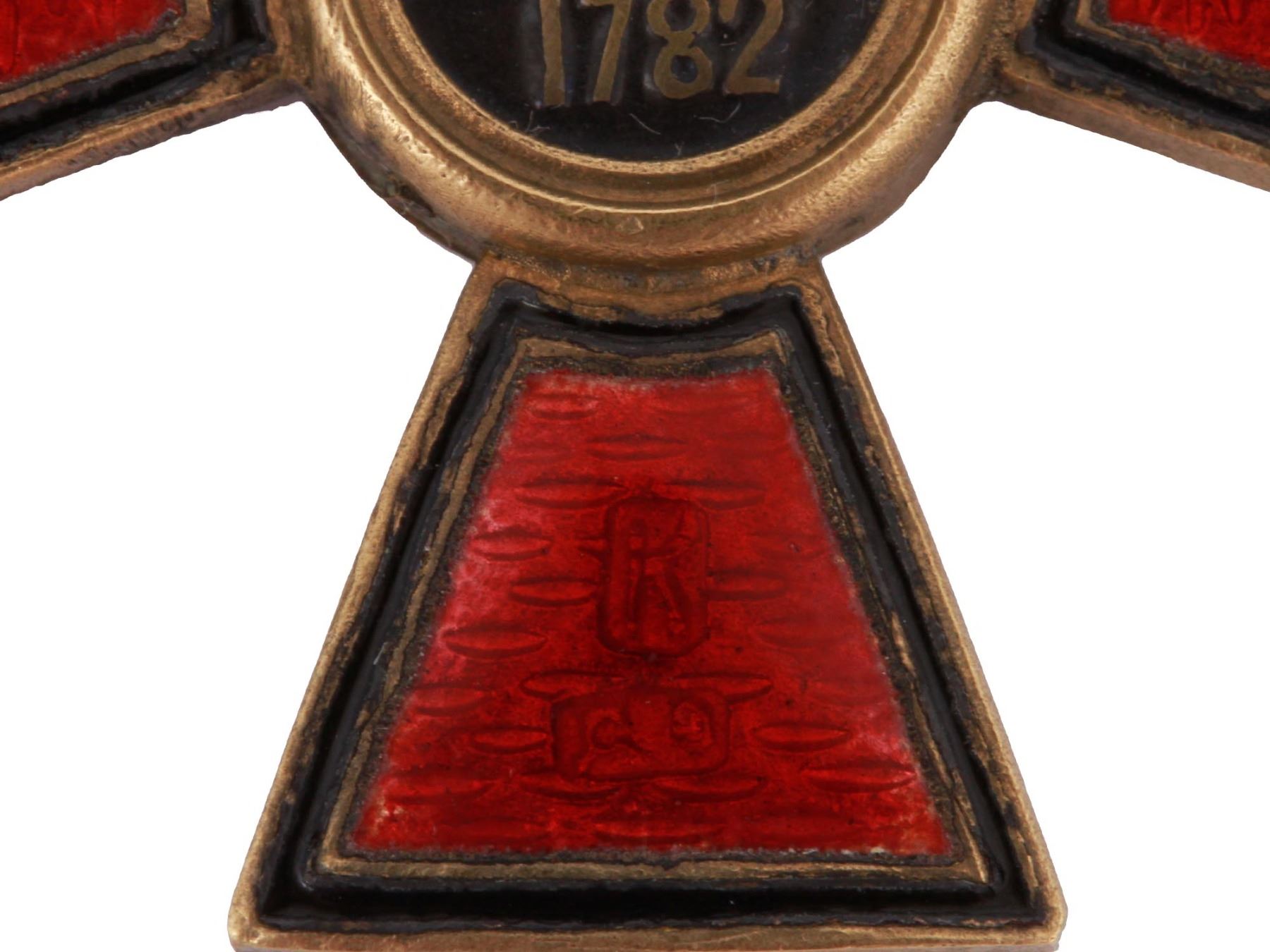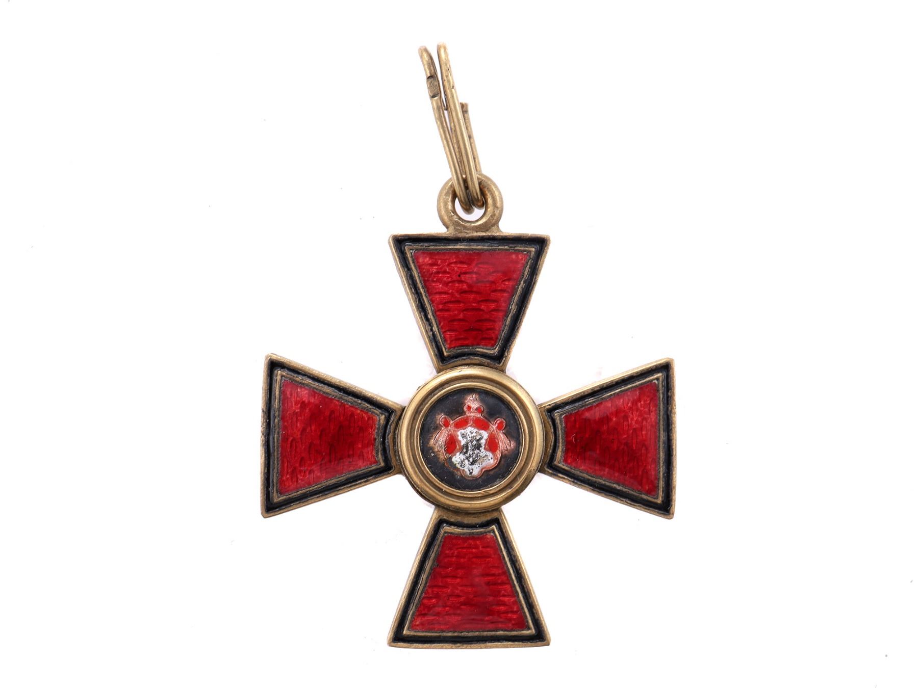 A Russian Imperial Order of Saint Prince Vladimir, 4th Class civil division breast badge. Features a bronze-gilt and red enameled cross. Marked K and Cyrillic DO for Dmitry Osipov on the low arm on the reverse under the enamel.