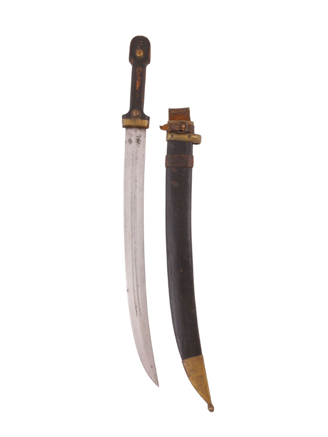 A Russian Imperial Army Artillery M1907 bebut dagger with its original scabbard, brass fittings and leather frog. The wooden handle is worn but in good condition and retains its brass fittings and the initial 'H' carved into the pommel. The blade is double-fullered on both sides and has a slight curve. The sheath is worn but in good condition. The dagger was made in Izhevsk Arms Factory during the WW1 period.