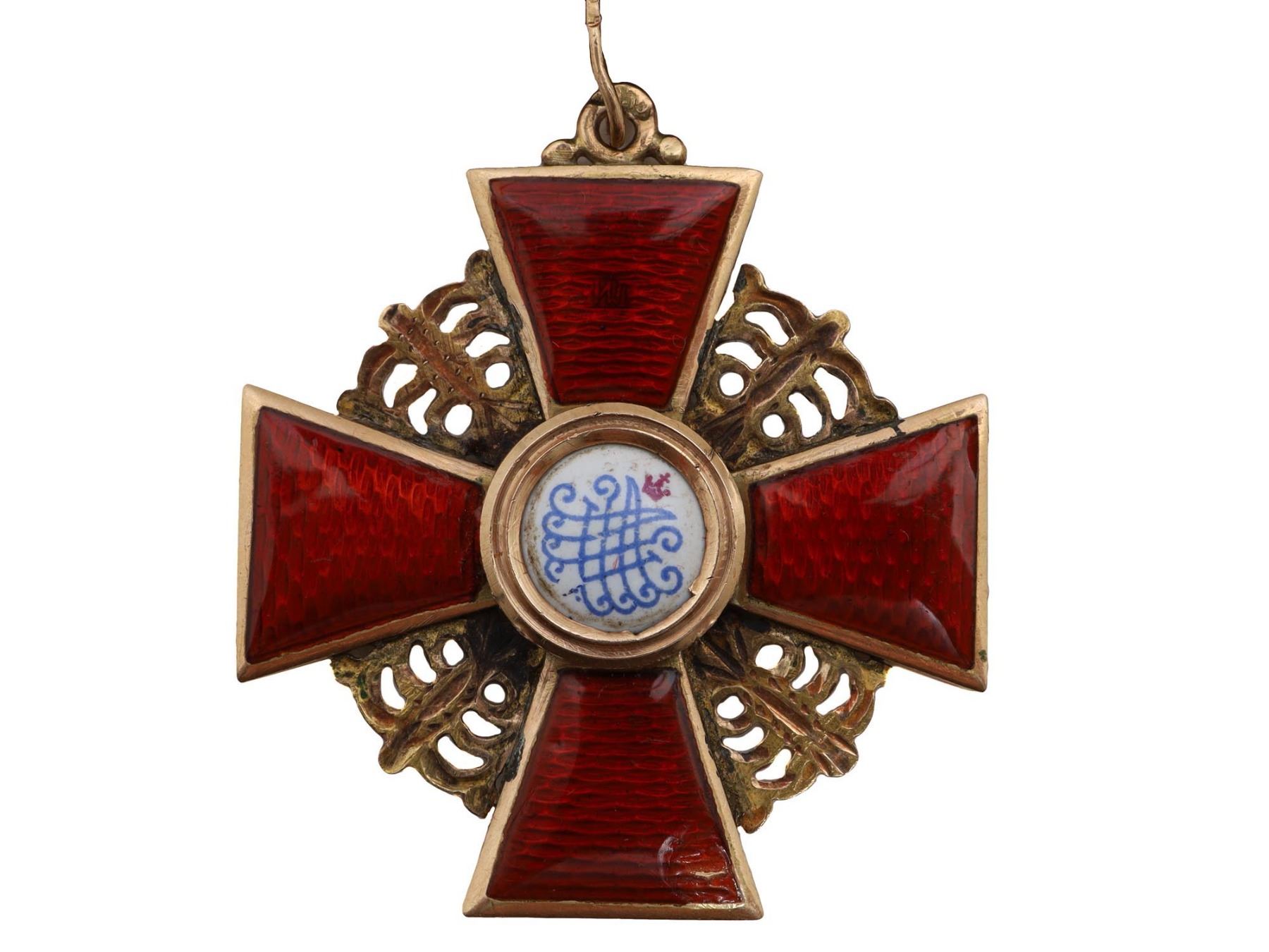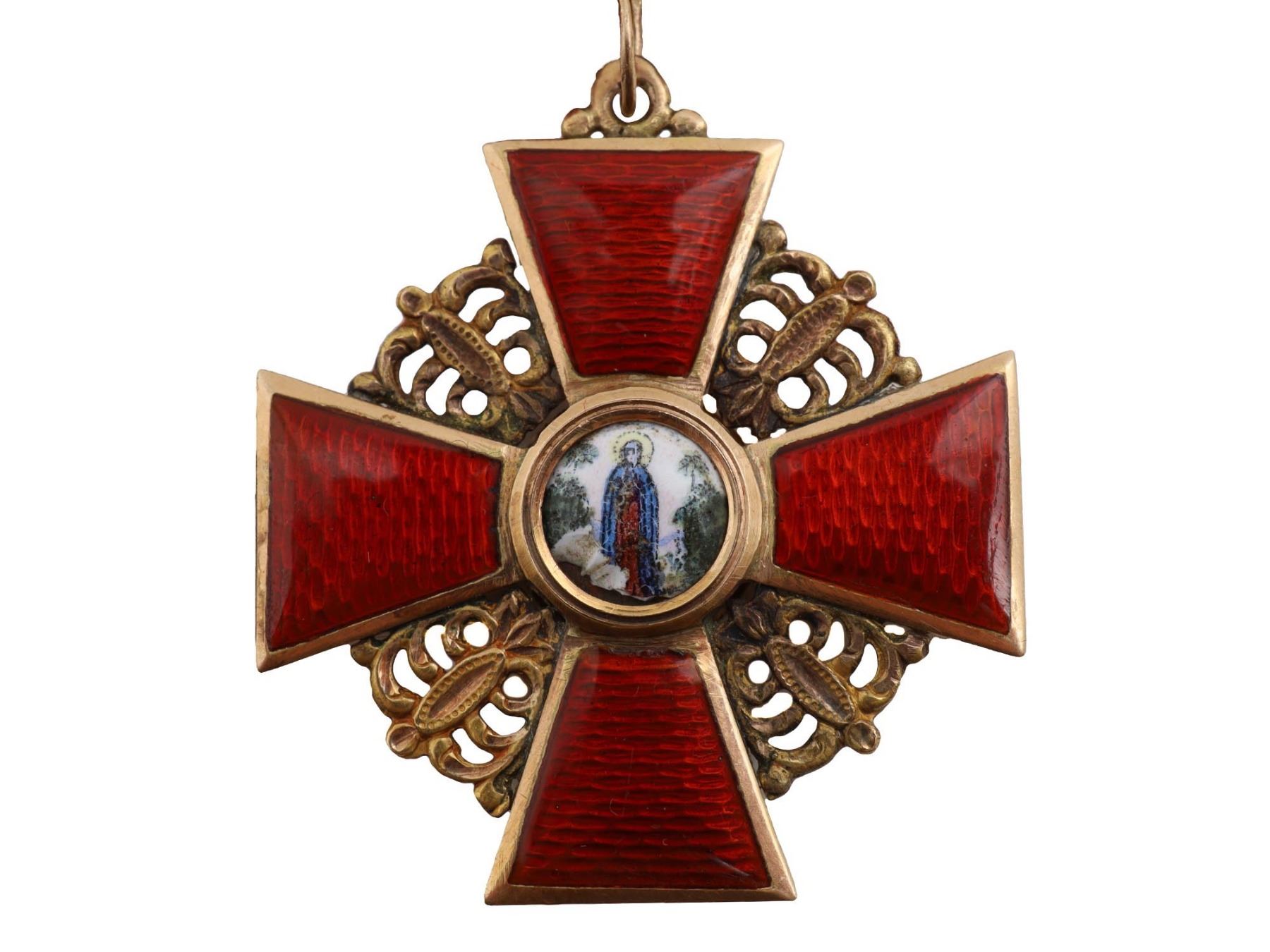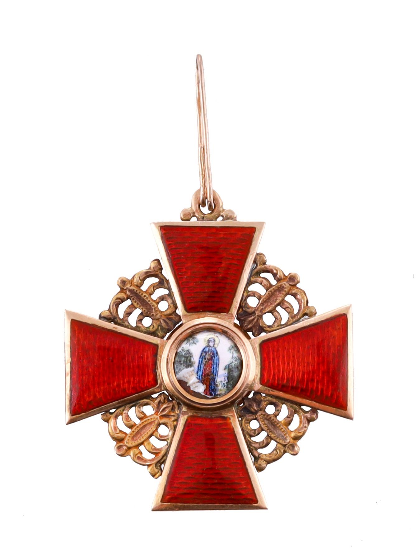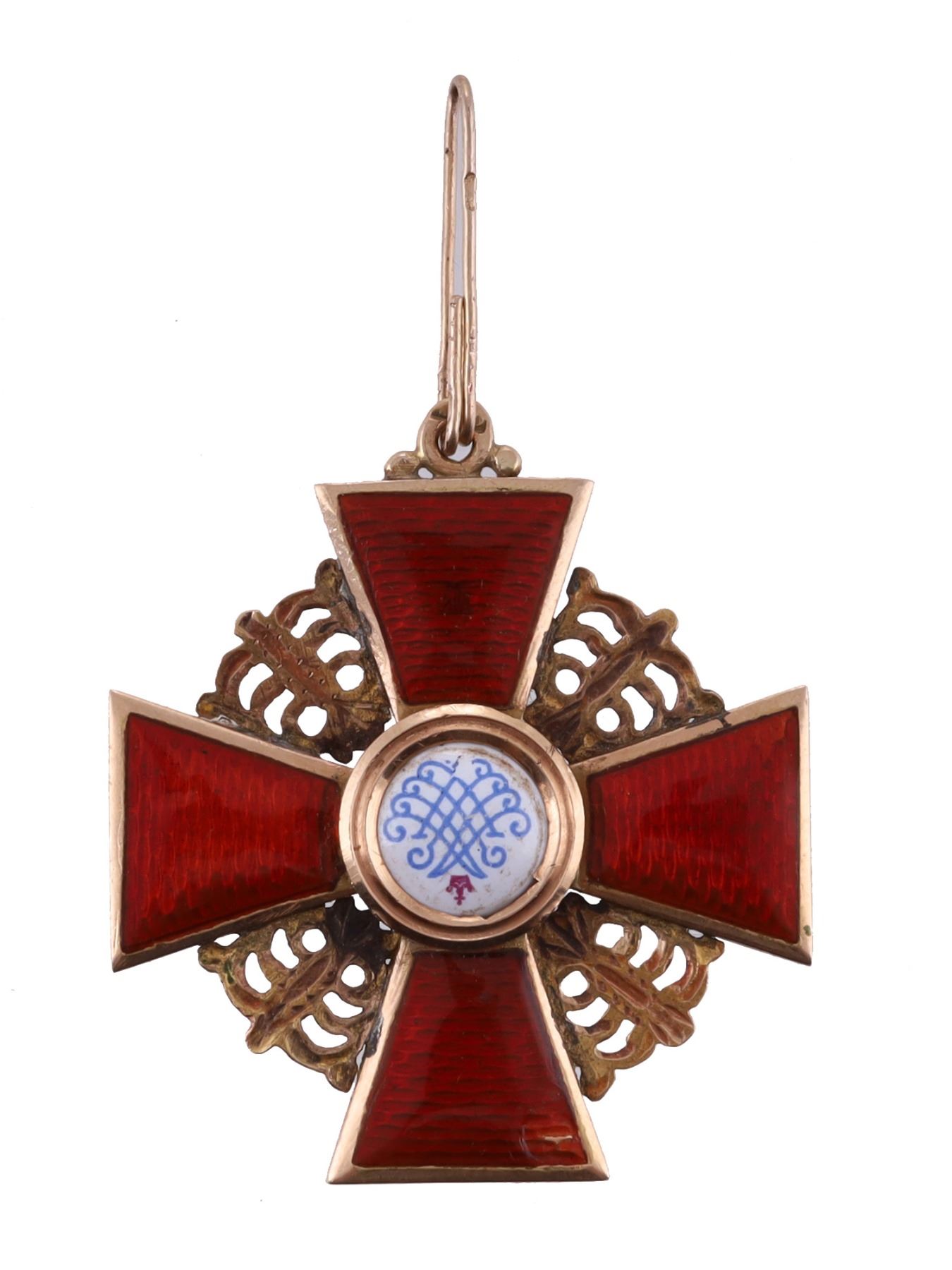 A Russian Imperial order of Saint Anne in Gold, III Class, c.1900. This example is a type two enameled order issued 1829-1917. A red enameled cross, constructed of solid 14K gold. The obverse center features a hand-painted miniature of St. Anne, the reverse center shows blue hand-painted initials on white enamel, and the integral ring is gold, hallmarked “56” for 14k gold, and "IL" (in Cyrillic).