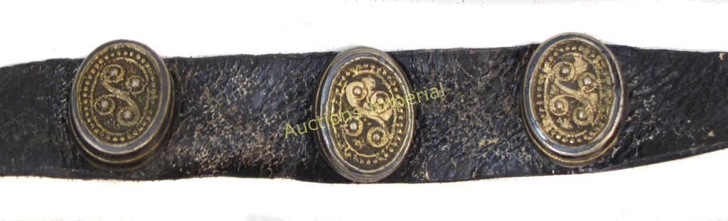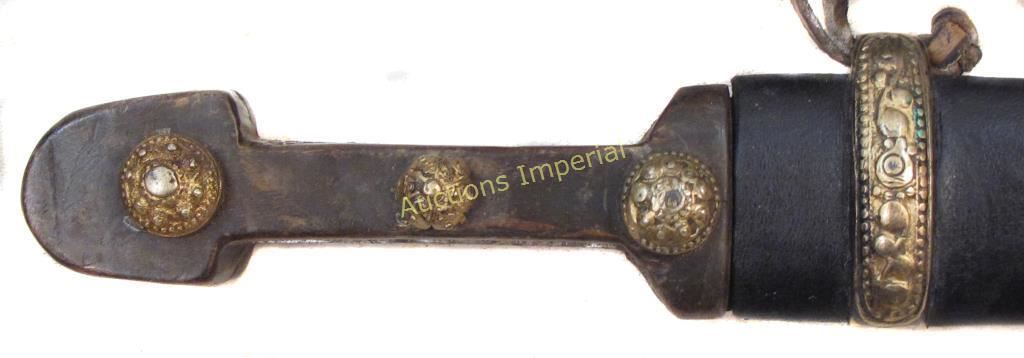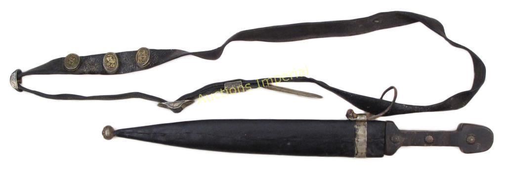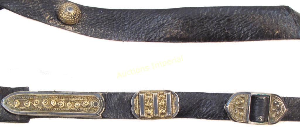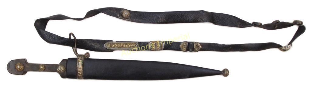 With horn grips, the silver mounts intricately filigreed and nielloed and heavily gilded. The robust, bifullered with tapering tip. In its leather-covered wooden scabbard with en suite gilded nielloed silver mounts. Retains its rare original matching belt with eight gilded and nielloed silver mounts. Latter 19th century. Leather replaced, blade with areas of minor pitting. Overall length 42.4 cm.
