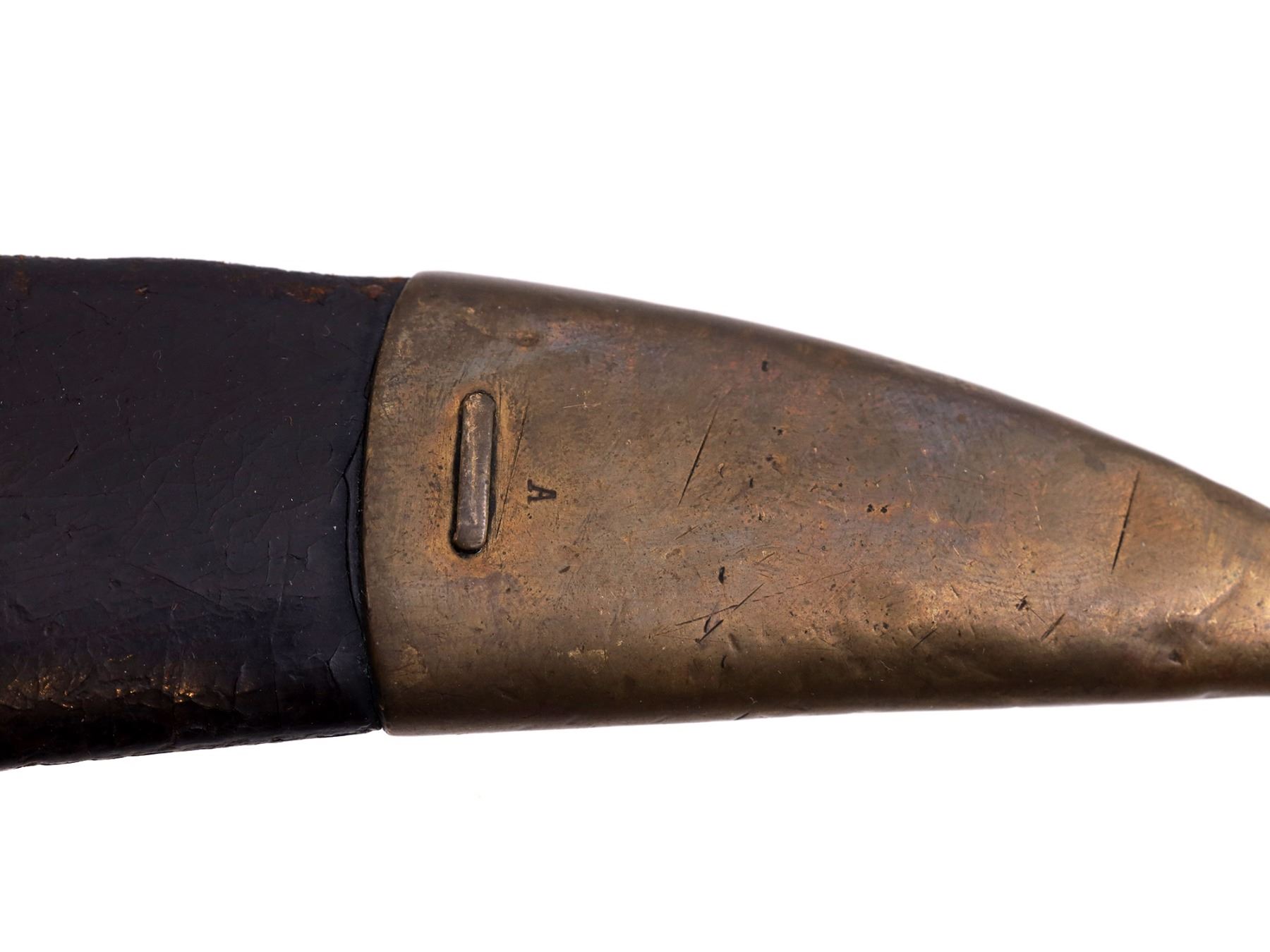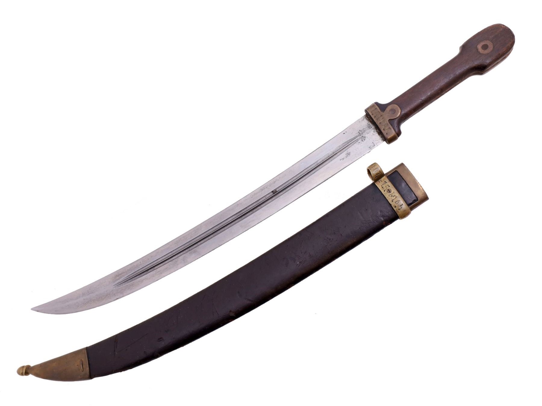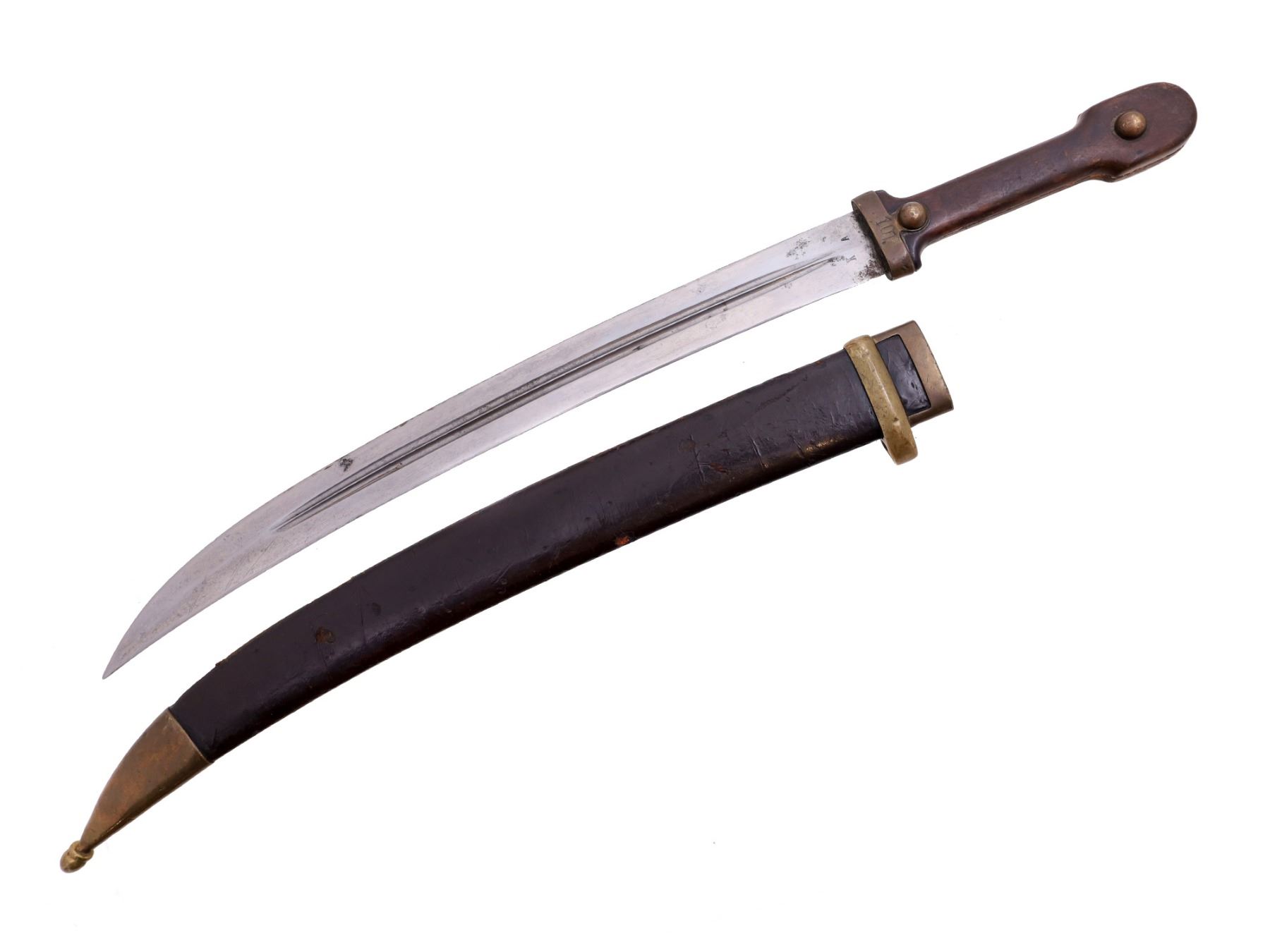A fine Russian M1907 Artillery bebut dagger (sidearm) dated 1912 on ricasso with well-read Russian arsenal maks on the brass mounts. Carved wooden grip, double-edged pointy blade, wooden scabbard covered with black leather.