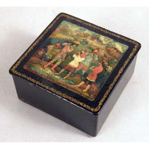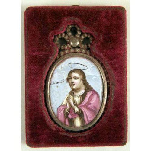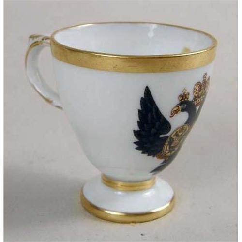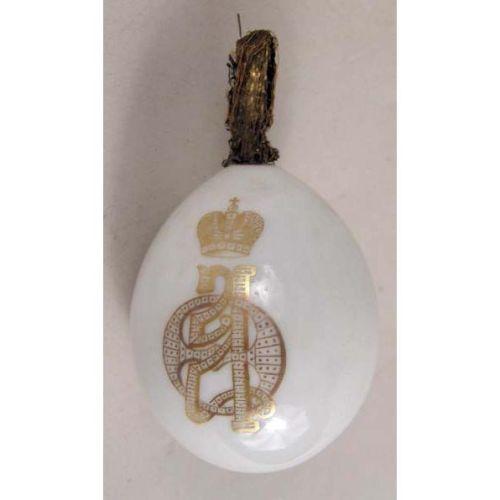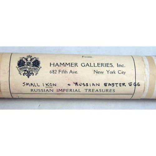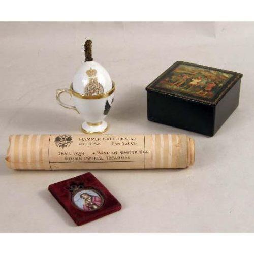 A RUSSIAN PORCELAIN EASTER EGG AND A SMALL ENAMEL ICON OF ST. JOHN<BR><BR>The egg with stand of the Imperial Porcelain Manufactory, St. Petersburg, gilded with the Imperial monogram of Czarina Alexandra Feodorovna, wife of Nicholas II, the late Czar of Russia, made in the Russian Imperial Factory at St. Petersburg, on the order of the Czarina, Easter, 1935. Provenance: from the Schaffer Collection of Russian Imperial Art Treasures, Rockefeller Center, NYC, property of Mrs. H. W. Hoover, with COA from Hammer Galleries, 2-1/2"h. The icon, depicting St. John the Beloved Disciple, Russian workmanship, c. 1830, mounted in red velvet, wrought silver frame with bowknot at top, hallmarked IS, 84, provenance, part of a Bishop`s mitre, from the Imperial Chapel, of the Feodorovski Cathedral Tsarskoye Selo, with COA from Hammer Galleries, 1937, 2" x 1-1/4", together with a Russian lacquer box from Palekh, provenance, gift to Polly Hoover Connelly, c. 1960`s, with letter describing object. 4 pieces