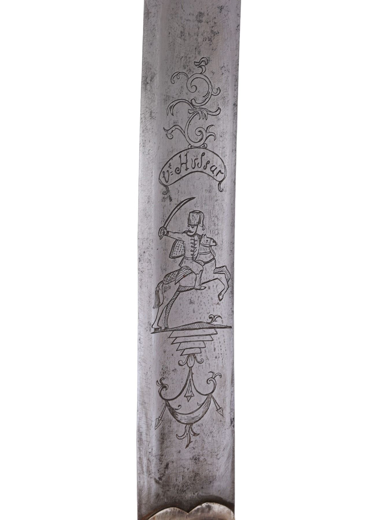 A Russian officer's shashka with an 18th-century blade and the cipher of Nicholas II on the pommel. The blade is a European sabre blade engraved with the phrase 'Vivat Hussar' set above an engraved depiction of a mounted hussar swinging his sword. The scabbard is wrapped in stitched black leather, possibly a later restoration, and its mounts are of niello.