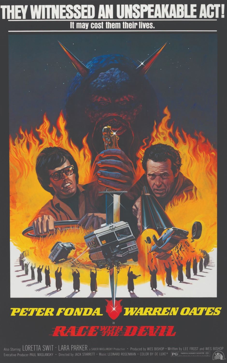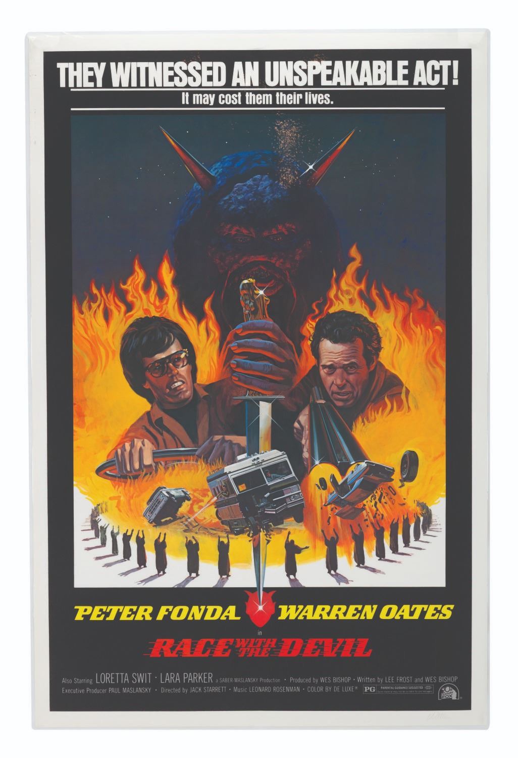 (20th Century Fox, 1975) A laminated one-sheet for"Race with the Devil," starring Peter Fonda and Warren Oats. Measuring 27.5" x 41.25", the poster is in good condition with light scuffing, soiling, creasing, bends, and pencil writing in the lower right corner.
