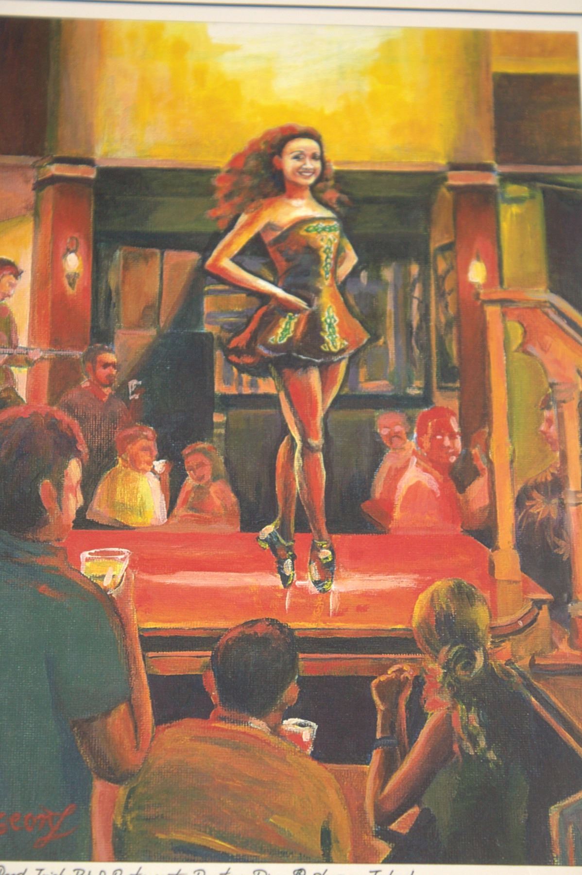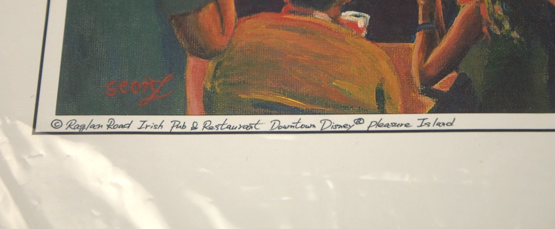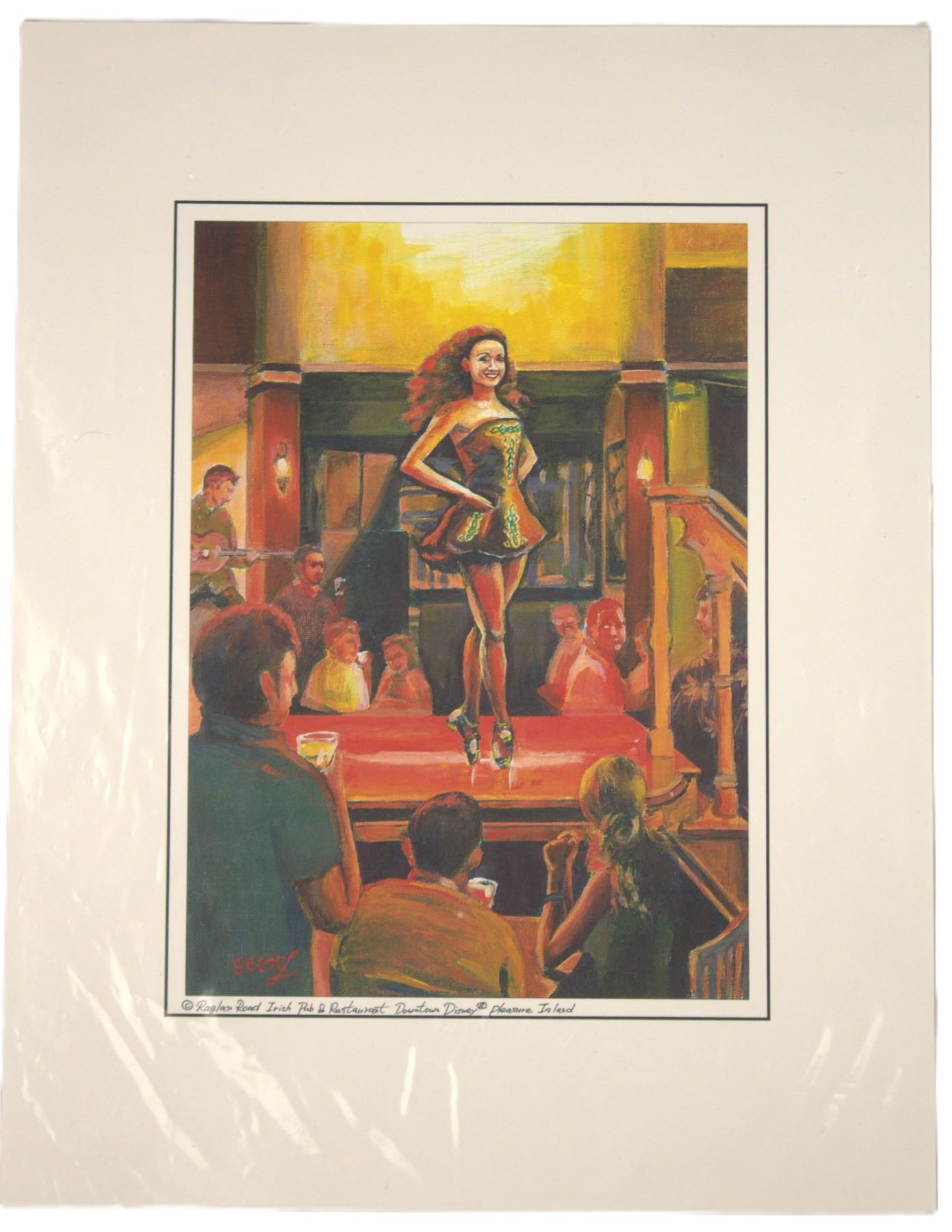 This watercolor reproduction measures 11" x 8.5" and is printed on heavy paper stock. The image is of an Irish dancer on the center stage inside of Raglan Road. Seon L is located in the bottom left of the print. Below the print on the is Copyright Ragland Road Irish Pub and Restaurant Downtown Disney registered Pleasure Island written in fine point pen.
