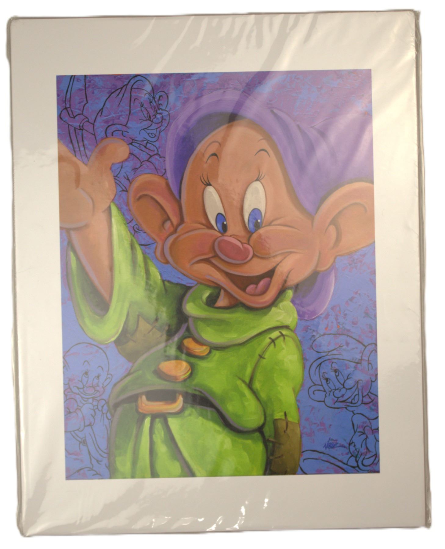 This is a colorful print of Dopey from the Snow White and the Seven Dwarfs animated film. The background is purple and blue and features several sketches of the character. The artist signature is in the lower right corner. It is printed on foam core board, is sealed, in new condition, and measures ~ 11" x 14".