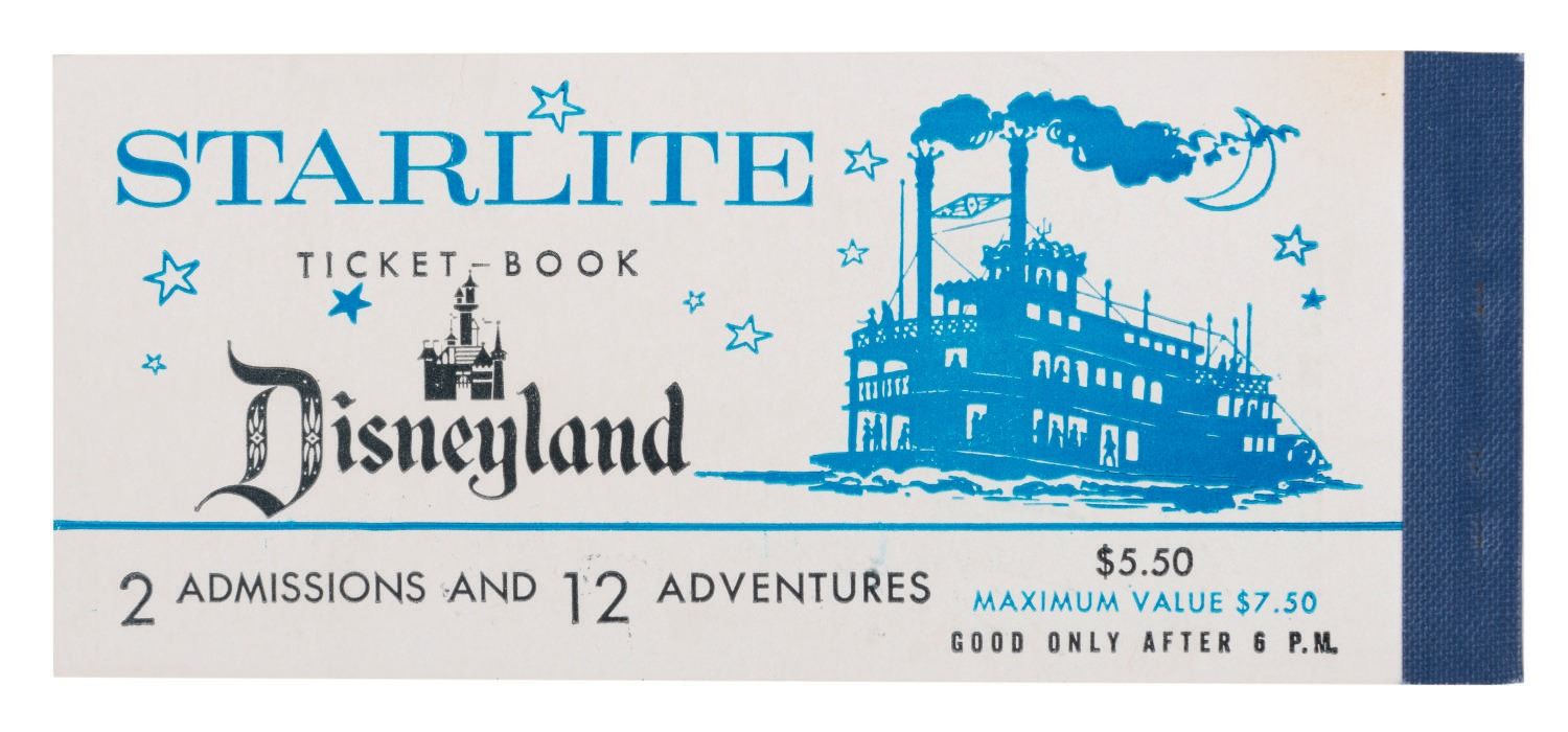 (Disneyland, 1960) An extremely rare complete ticket book and admissions to Starlite Nights at Disneyland. Originally called Date Nite, the event was renamed Starlite Night and would occur on various nights throughout the year. The unused book measures 6"x3" and features two admissions to Disneyland and (12) rde coupons. This particular book is stamped "complimentary" on the cover. Because these events were only a few nights a year, only a limited number of these books were produced. This is the first unused book we have ever seen and the only one we know of in private hands.