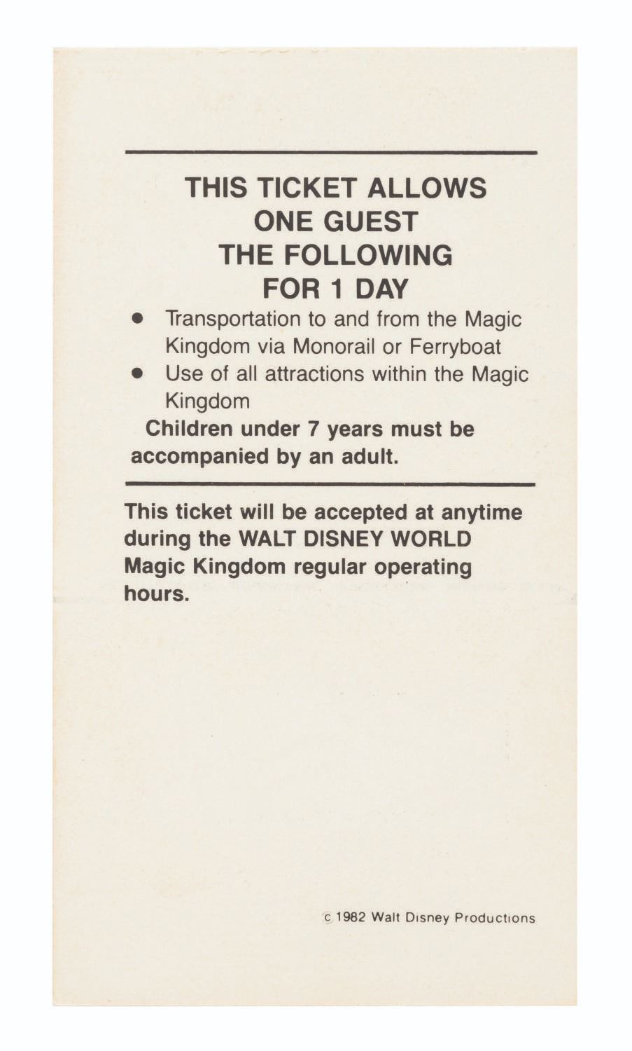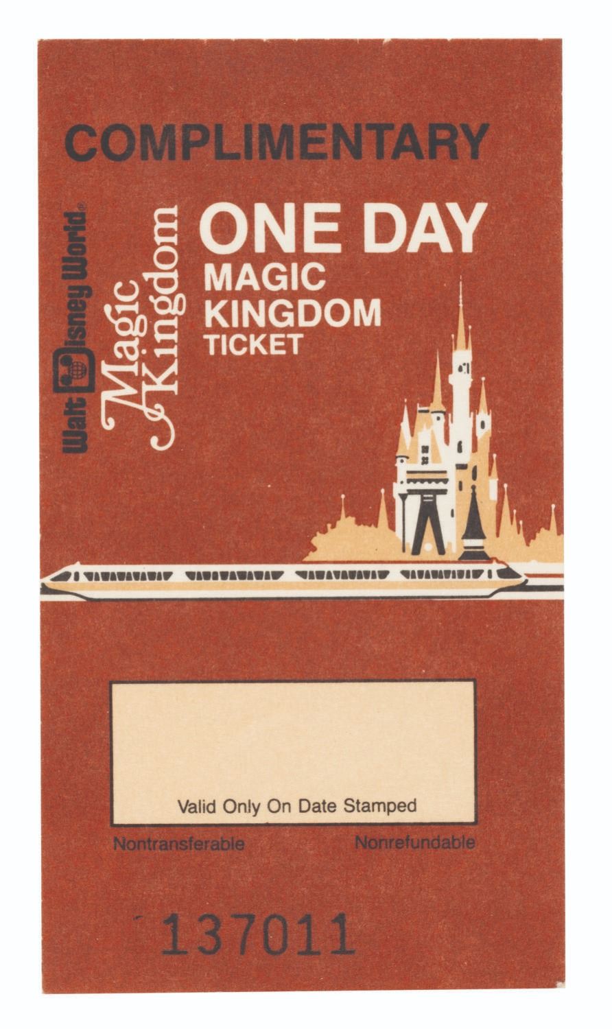 (Walt Disney World, 1982) An unused complimentary one-day ticket for the Magic Kingdom at Walt Disney World. The passport allowed admission to the Magic Kingdom with transportation to and from the Park via the Monorail or Ferryboat. Numbered 137011, the ticket measures 2.5" x 4.25" and is in very good condition with very light wear on one corner.