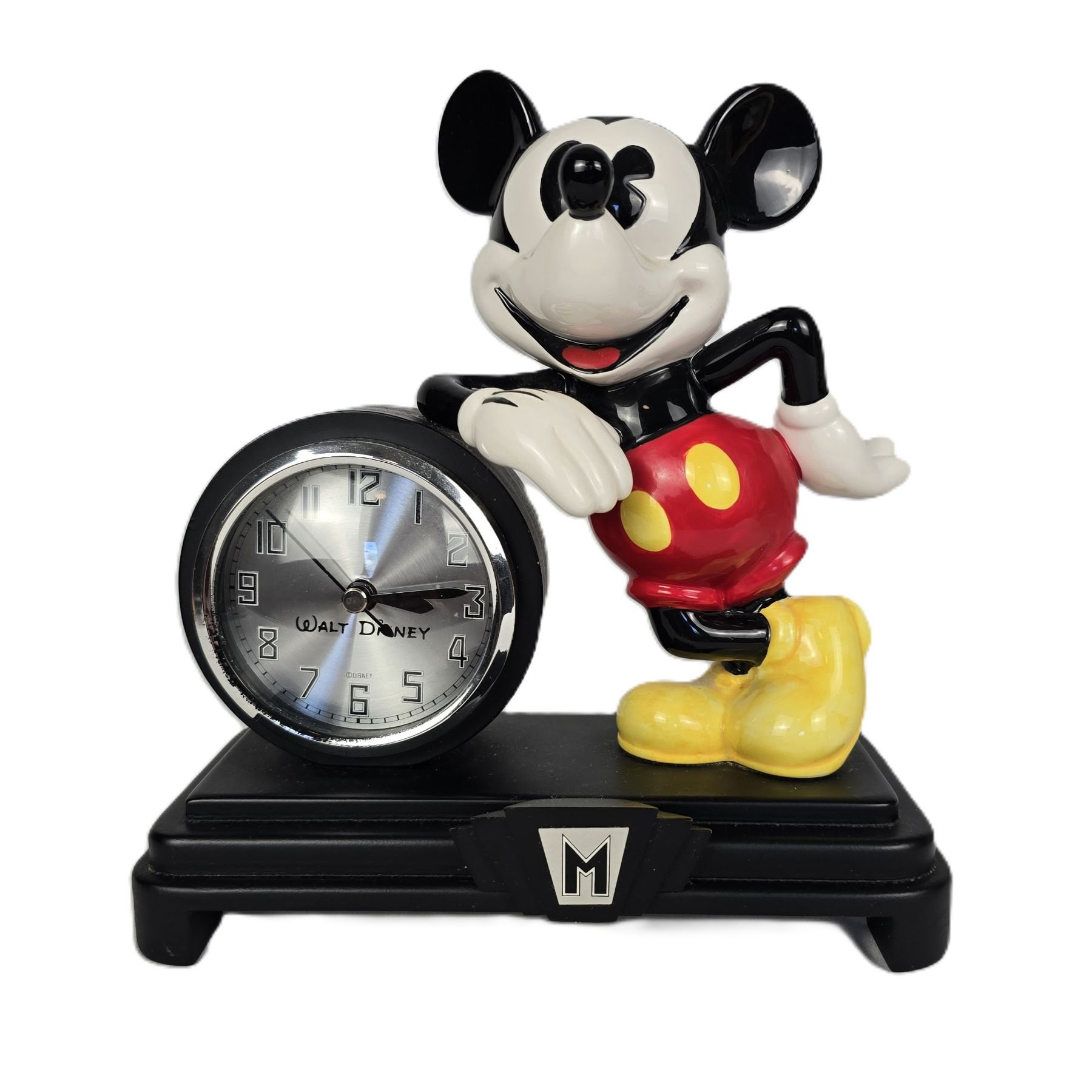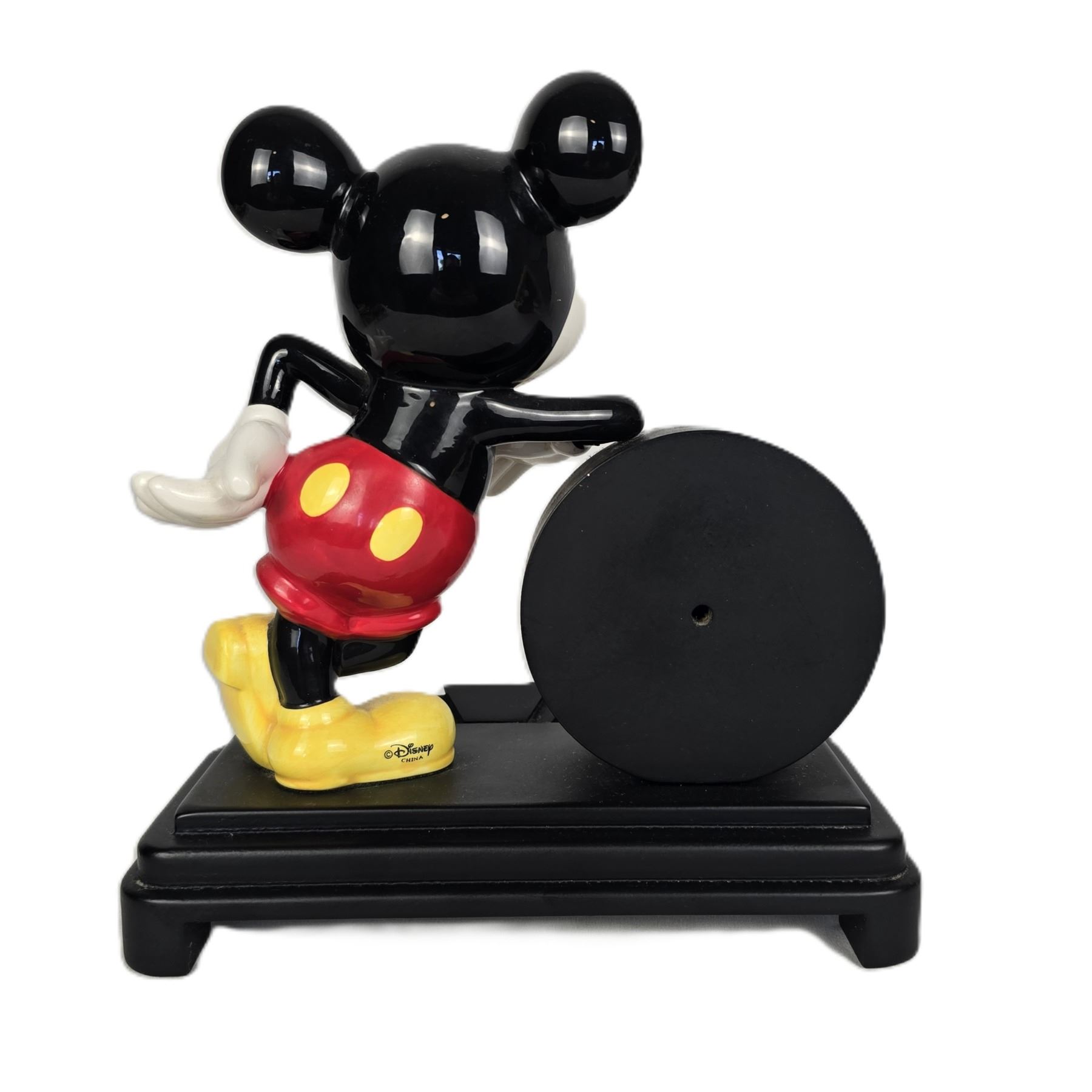 This clock features a pie-eyed Mickey Mouse leaning on a round silver-toned faced clock. The Mickey Mouse figurine is ceramic. They both sit atop a metal base with the small art deco style marquee. The figurine is in good condition. The clock face has some paint wear. Untested. It measures 9” x 5” x 10” and weighs 1 lb 15 oz.