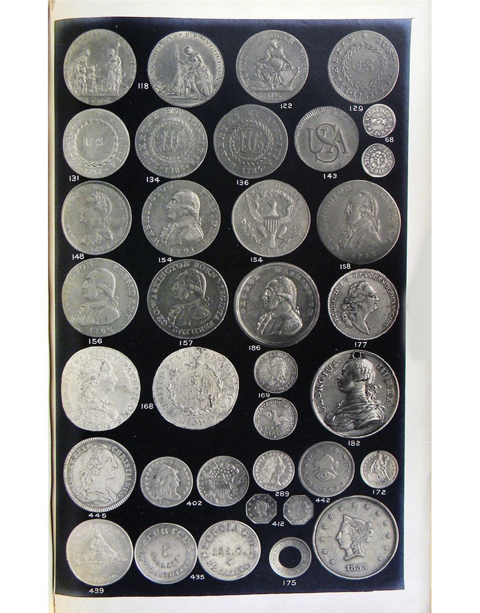 Chapman, Henry. CATALOGUE OF THE COLLECTION OF AMERICAN COLONIAL COINS FORMED BY GEORGE J. BASCOM, ESQ., NEW YORK CITY, AND THE COLLECTION OF UNITED STATES COINS OF WILLIAM F. BROWN, ESQ., SPRINGFIELD, OHIO. Philadelphia: Messrs. Davis & Harvey, Auctioneers, Jan. 16, 1915. 8vo, original white cloth and boards, gilt. vi, 66, (4) pages; 751 lots; 4 fine photographic plates; prices realized list bound in. Final plate with marginal tear not affecting coin image. Covers a bit discolored. Near fine. Rarely offered with plates. Adams A-: "Betts 383 [Tuesday Club medal] in pewter. Choice Mass. silver plus many rare colonials. Unique Birch 1¢. RRR Bechtlers. Proof 1852-58 $1." American colonial coins and other early pieces are depicted on the first three plates; Plate III also illustrates several pioneer gold pieces and early United States silver coins; choice early silver dollars and large cents are depicted on the final plate. A notable sale for early American coins and medals. Clain-Stefanelli 12484. Davis 205.