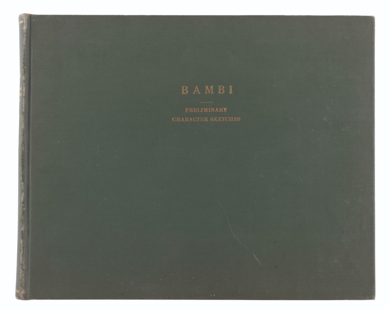(Disney, 1938) an extremely rare bound volume of studio photostat preliminary model sheets for Walt Disney's "Bambi." Most likely bound as a reference tool after completion of the film, the book contains 38 photostat model sheets of early character and movement suggestions for the film. The book measures 14"x11.25" and is in good used condition with noticeable wear. The enclosed model sheets are in very good condition with light wrinkling from age.