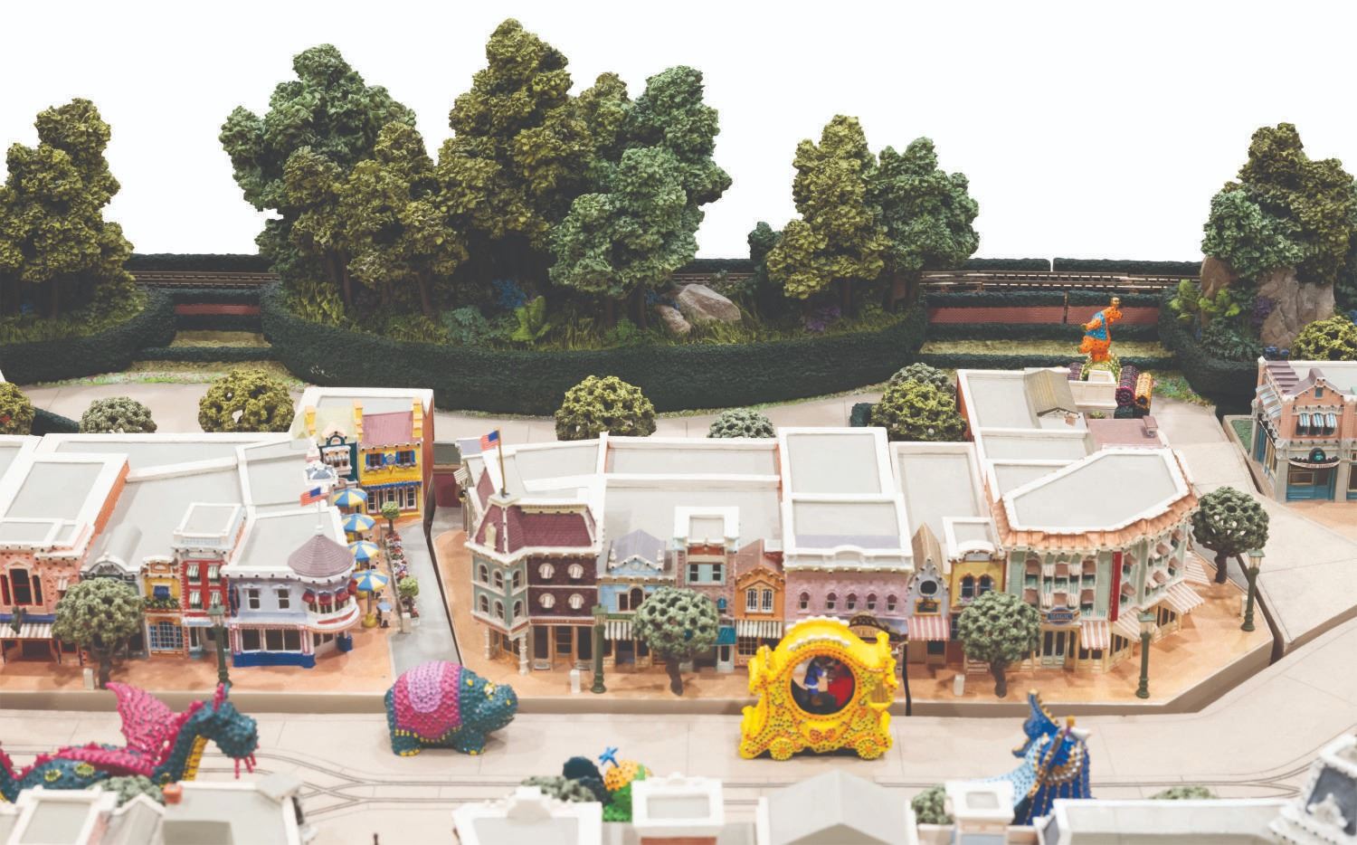 (Disneyland, 2002-2012) A stunning large model of Disneyland by renowned miniaturist Robert Olszewski. Olszewski created a series of highly detailed "Z Scale" 1/220th replicas of the buildings in Disneyland's Main Street U.S.A. between 2002 and 2012. Although sold individually, a platform was made that allowed collectors to take the buildings off the display bases and assemble the entirety of Main Street from the Park’s entrance to the Hub and Sleeping Beauty Castle. Very few of these platforms and sets were sold, and even fewer were completed. This amazing set completes Olszewski's faithful recreation of Main Street in a jaw-dropping display. In addition to the buildings, platform, and tree accessory pieces, this set also includes both additional Electrical Light Parade sets, four Main Street vehicle sets, three vendor with cart sets; and five Main Street Cast Member sets including Dapper Dans, Carolers, Princesses, the Fab Five, and the entire Disneyland Band. An Olszewski touch-up paint kit is also included. The model measures approximately 72" x 35", and is in very good condition with expected light wear from previous display including a few small chips and scuffs, and one tree broken but functional to the right of Floral Mickey at the Park's entrance. Not all of the original boxes or separate building bases are included. This item may require special shipping arrangements. Please inquire for details and estimates.