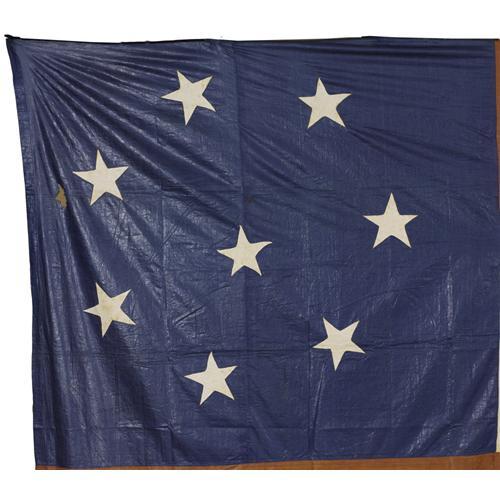 <B>A Rare Confederate Eight-Star First National Flag</B></I> This Eight-Star Confederate First National flag still retains its vibrant colors and is beautifully hand sewn on polished cotton. At 140βon its fly and 75β at the hoist, this flag is a rare configuration of seven stars arranged in a 36β circle around a central star in the middle of the polished cotton blue canton. The two red bars divided by one white bar make this a classic First National Confederate design, but this particular pattern with eight stars makes up only 10% of the known First National designs.<BR><BR>As Virginia was the eighth state to secede from the Union on April 17, 1861 followed by Arkansas as the ninth only 30 days later, this flag was only authorized during that 30-day interval. Most of those known to exist in museums are from the Western Theater of the war, mostly from Louisiana or Mississippi regiments. Units of the famous New Orleans Washington Artillery and the Charles Clark Rifles of the 12th Mississippi are just a few of the units that flew this sort of flag. Indeed this flag was possibly made in New Orleans due to its early dating and construction. A stenciled number '25', 1β in height appears in black ink on the obverse of the flag on the fly edge.<BR><BR>Noted flag conservator Fonda Thomsen examined the flag and there were no alterations or repairs found during the examination. Significantly, the noted author and flag expert Howard Michael Madaus examined this flag as well. His authentication, research and analysis are included with this rare Confederate First National flag adding to its historical importance.<BR><BR><b>Shipping:</b> Flat Material, Large (<a target="_blank" href="http://www.heritageauctions.com/common/shipping.php">view shipping information</a>)