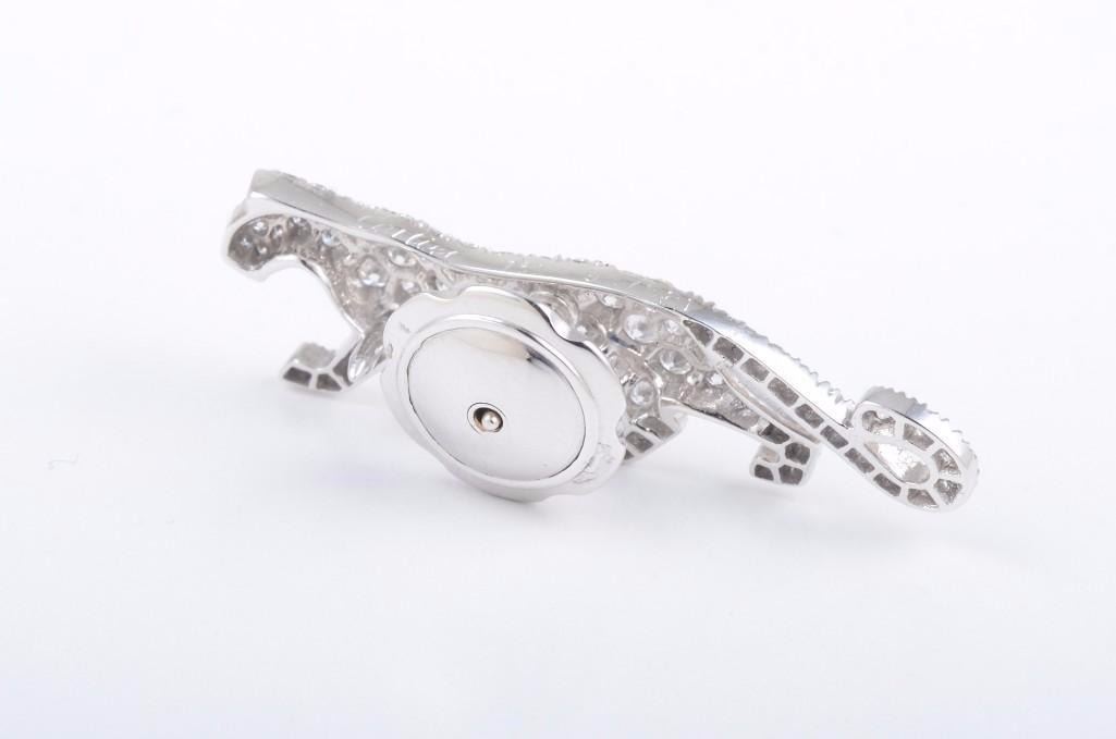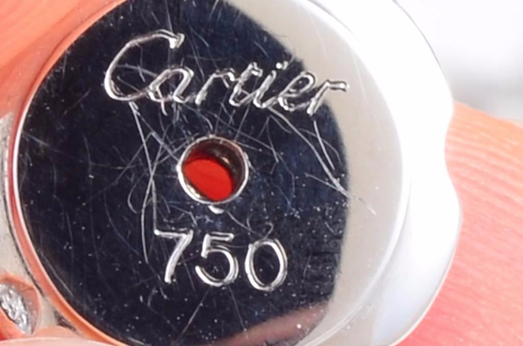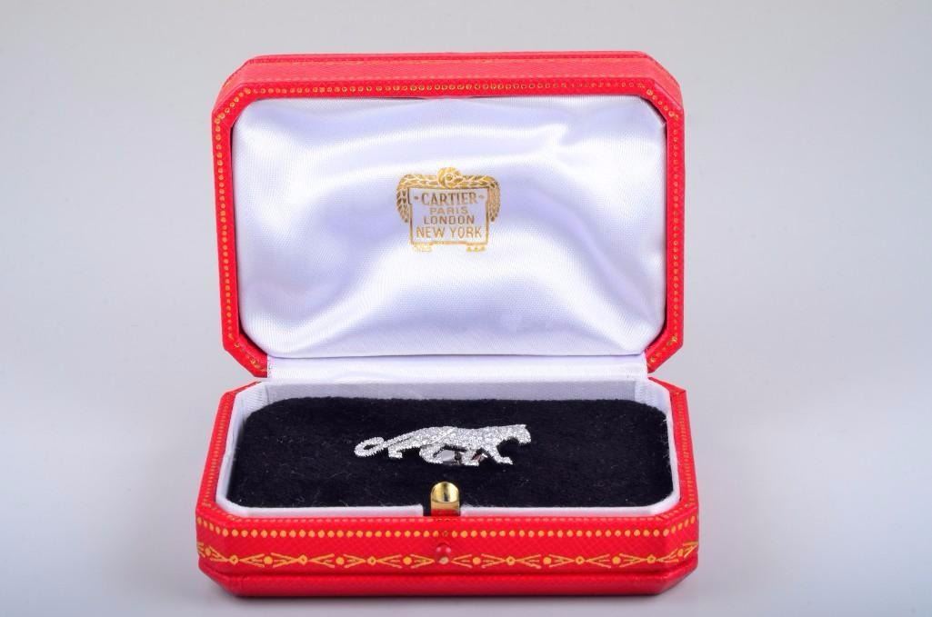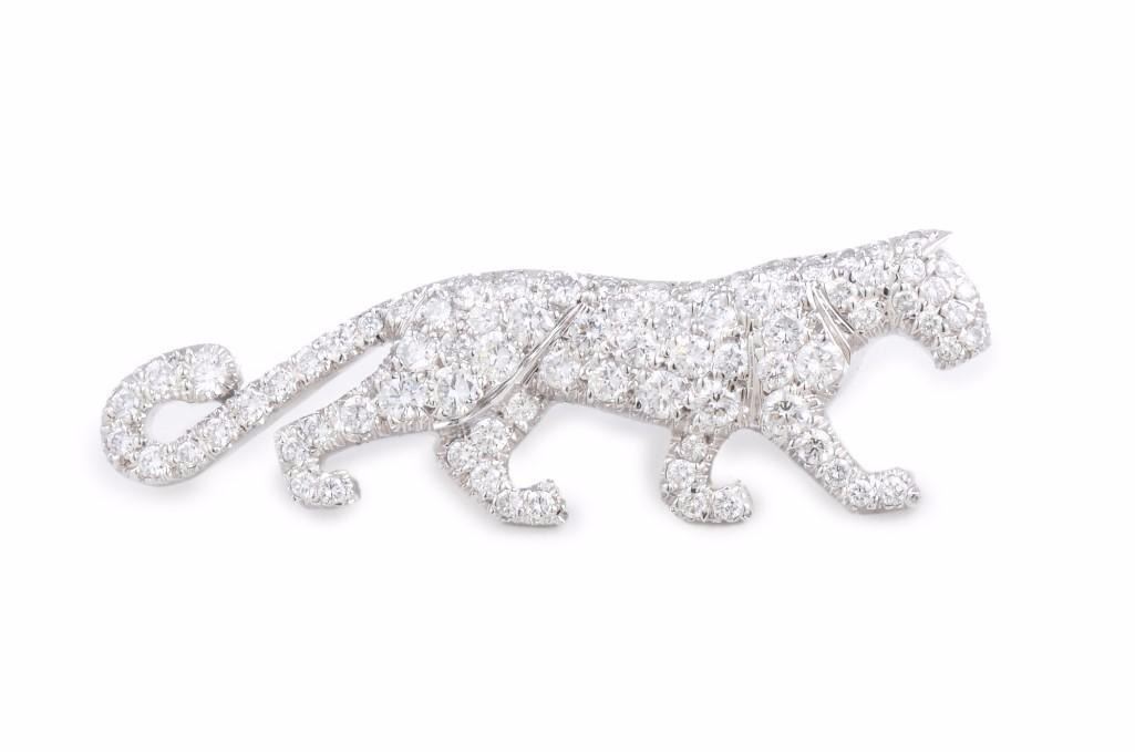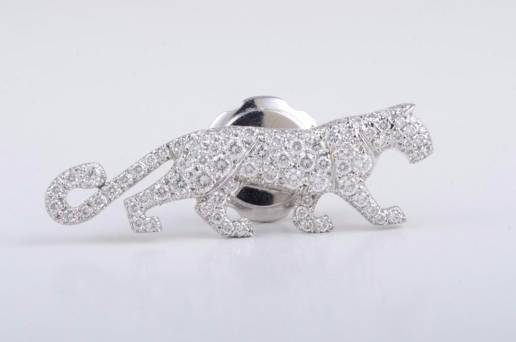 Designed as a lean figure of a walking panther, with approximately 1 carat of high-qualitypavwhite diamonds; set in 18K white gold; signed Cartier 750 on pin backing and Cartier 750 95756P1 along the panther's back; measures 1-3/8 x 3/4 inches; comes with Cartier box.