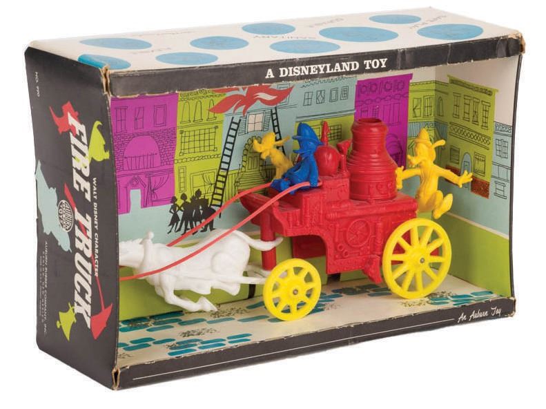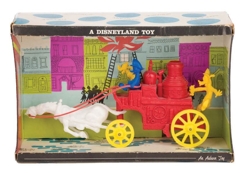 (Disneyland, 1960s) A rare Disneyland Fire Truck Toy in the box. The plastic and rubber toy of a turn-of-the-century horse-drawn chemical wagon comes with figures of Donald Duck, Goofy, Pluto, and a horse. Measuring 10.5" long and 5" tall, the toy is in fine condition, and still packaged within its rarely-seen box. The good condition box has mild bending and slight creases and wear to panels, edges, and corners.