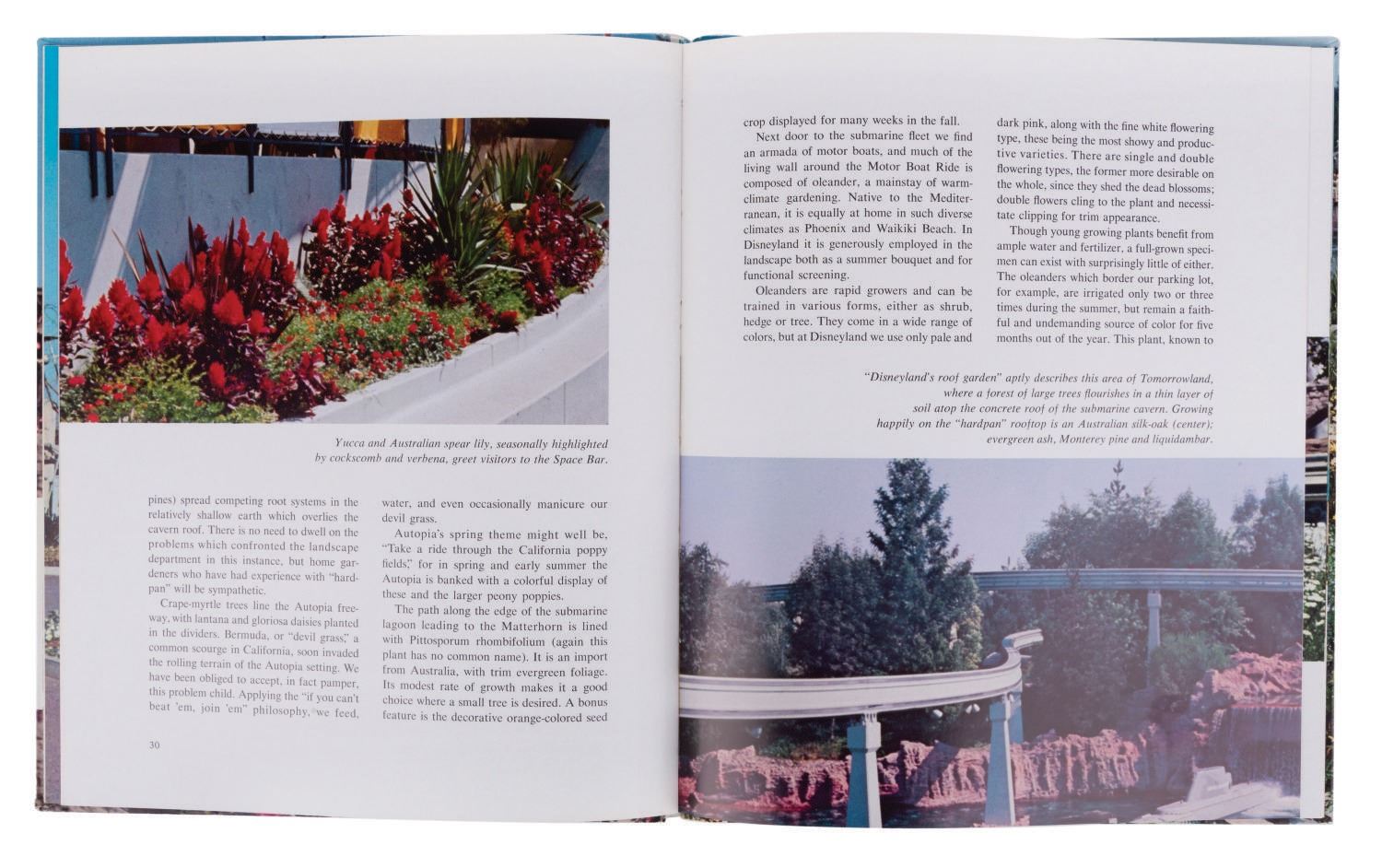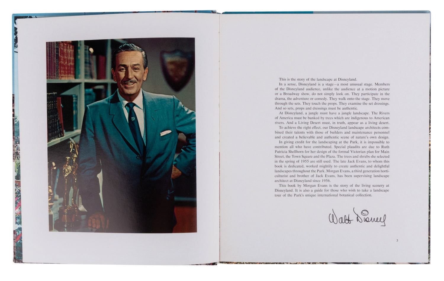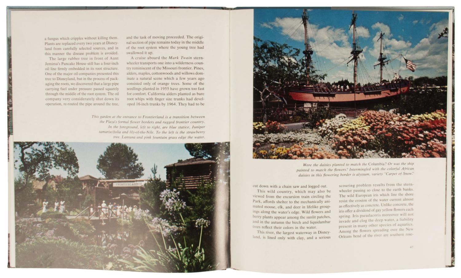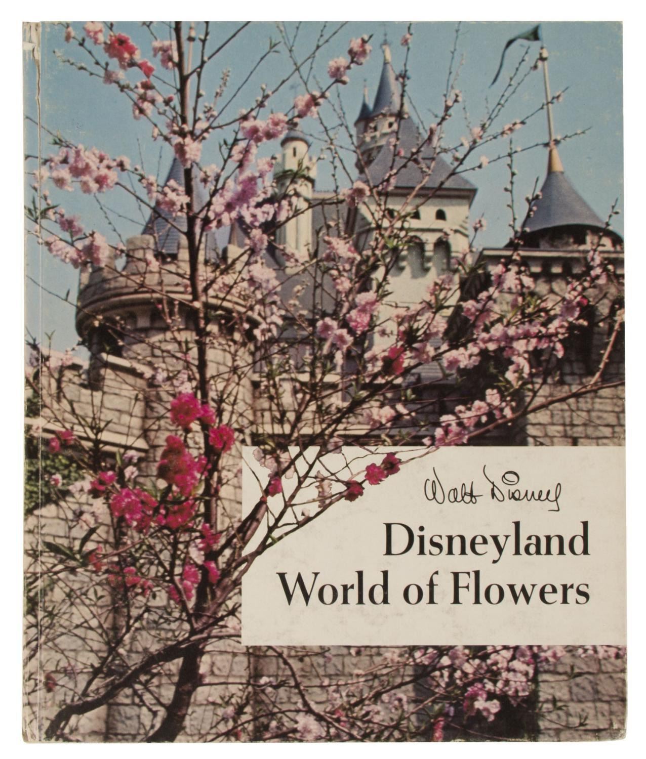 (Disneyland, 1965) A very rare "Disneyland World of Flowers" hardcover souvenir book. This book was written by famed Disneyland horticulturist Morgan "Bill" Evans. This book was only published in 1965 and is a testament Walt Disney respect for the work of his lead Disneyland landscape architect. The book features terrific vintage photos with rare details of the park and its wide variety of plants. The book measures 11.25"x9.25" and is in good condition with some cover wear, including some splitting along the spine.