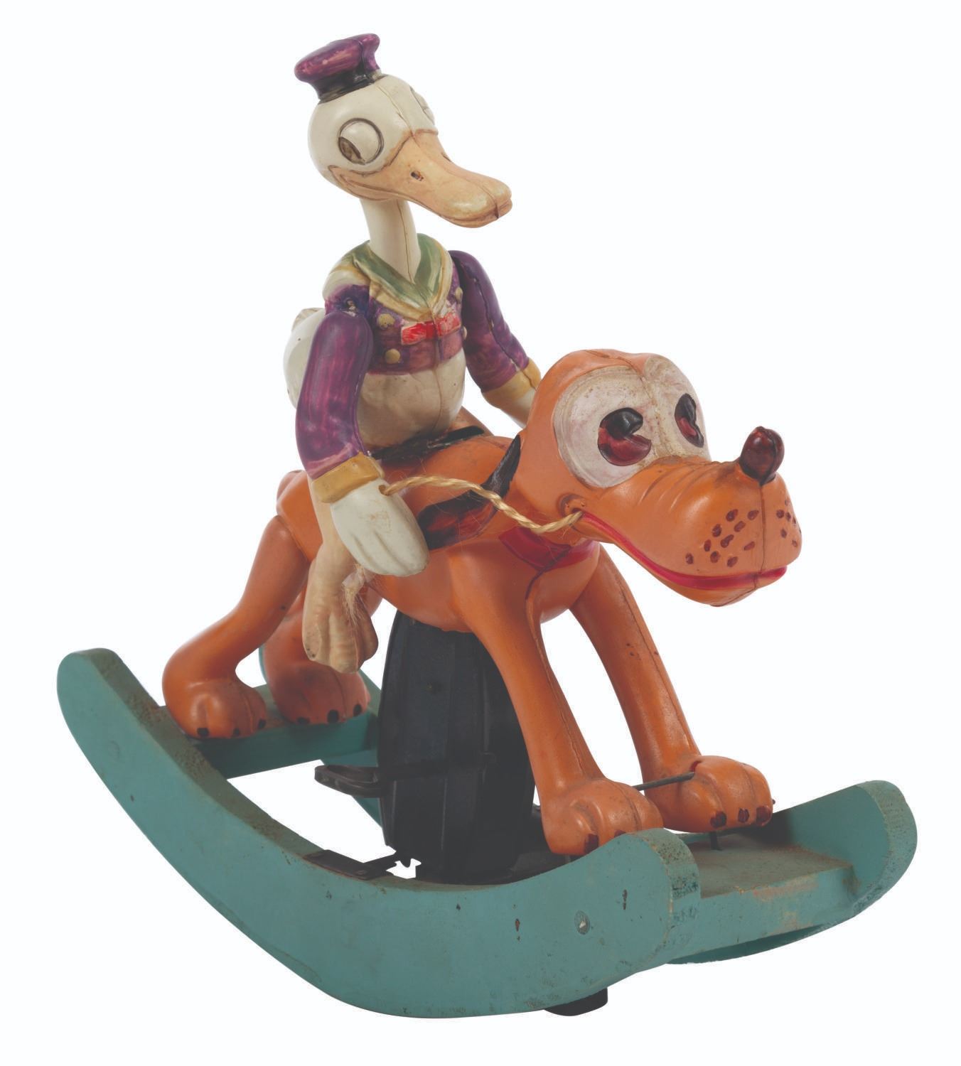 (Japan, 1930s) A rare Japanese celluloid toy of Donald Duck riding a Pluto rocking horse. Pluto is attached to a tin wind-up mechanism with a built-in key and a painted wood rocker base. The toy has been tested and when wound rocks back and forth. The original Japanese inspection sticker is still attached to the underside of Pluto. Measuring 8” x 2.5” x 8" tall, the toy is in very good condition with some light paint loss from age and wear.