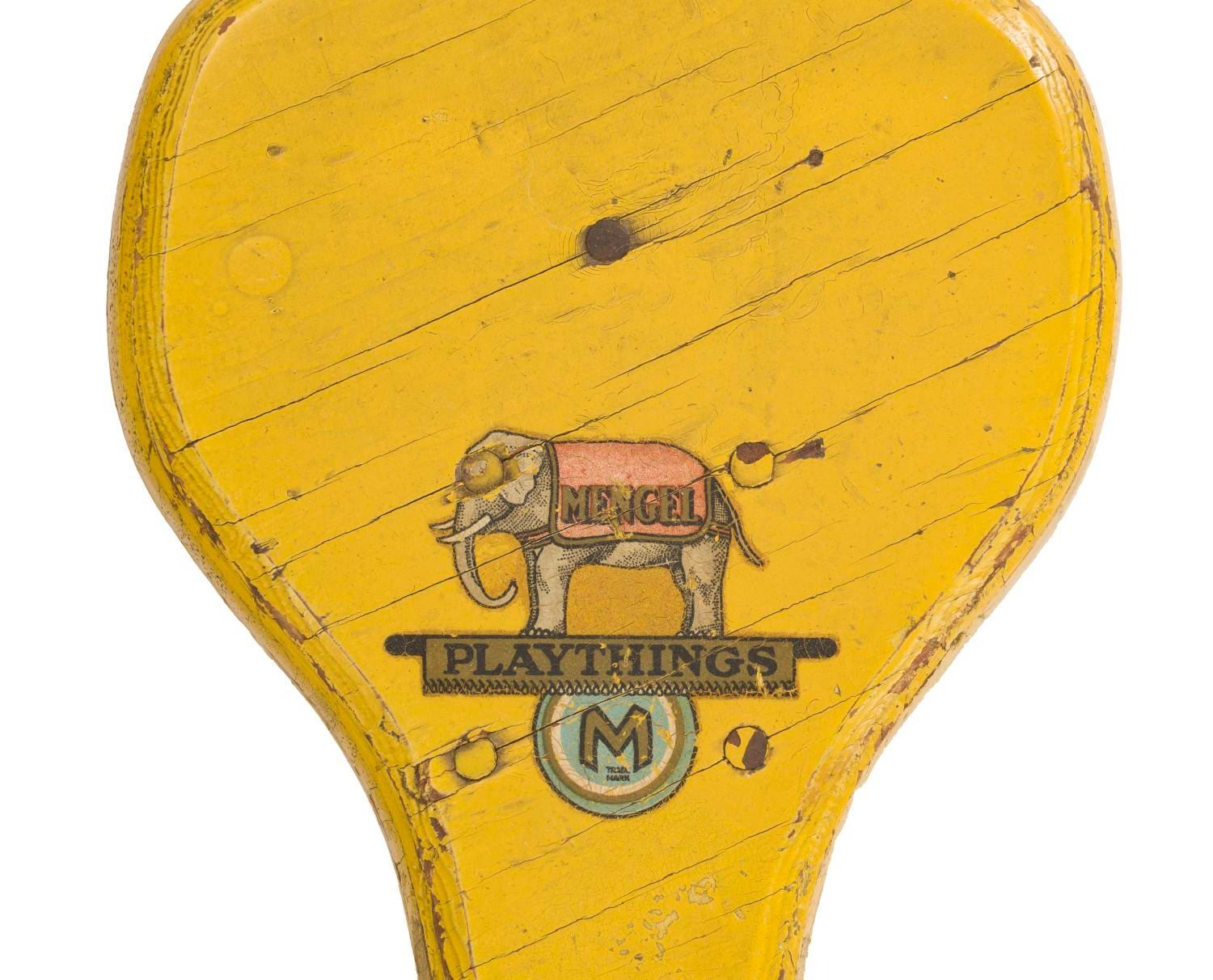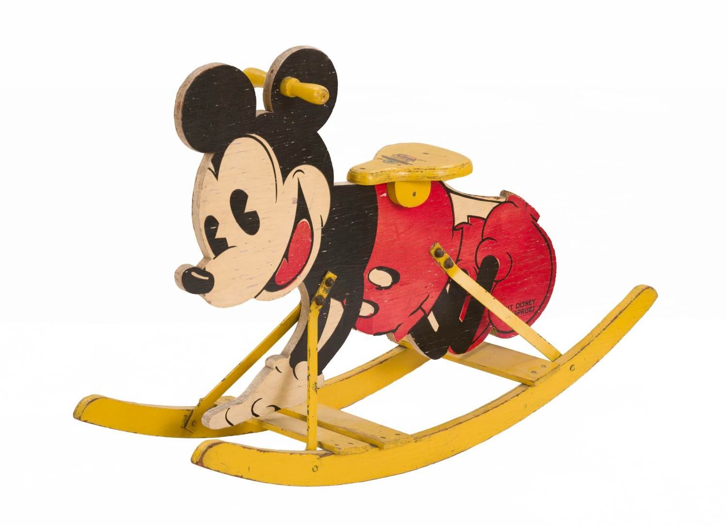(Mengel Playthings, 1930s) A very rare early Mickey Mouse rocking horse by Mengel Playthings of Louisville, Kentucky. Assembled and painted by hand, the wooden riding toy with metal supports bears a Walt Disney Enterprises copyright and a Mengel logo decal on the seat. Measuring 36” x 11.25” x 24” tall, the toy displays in good condition for its age, with paint loss, cracks, chips, wear, and deep scratches throughout.
