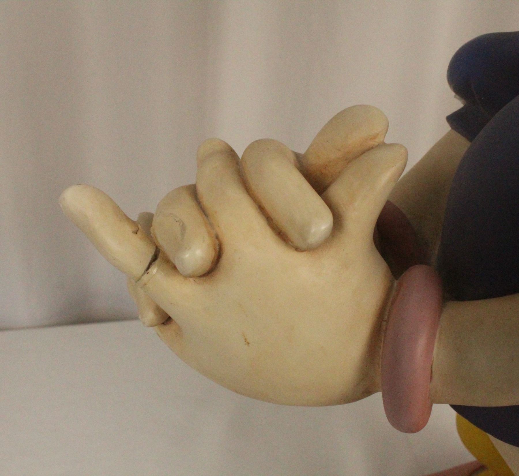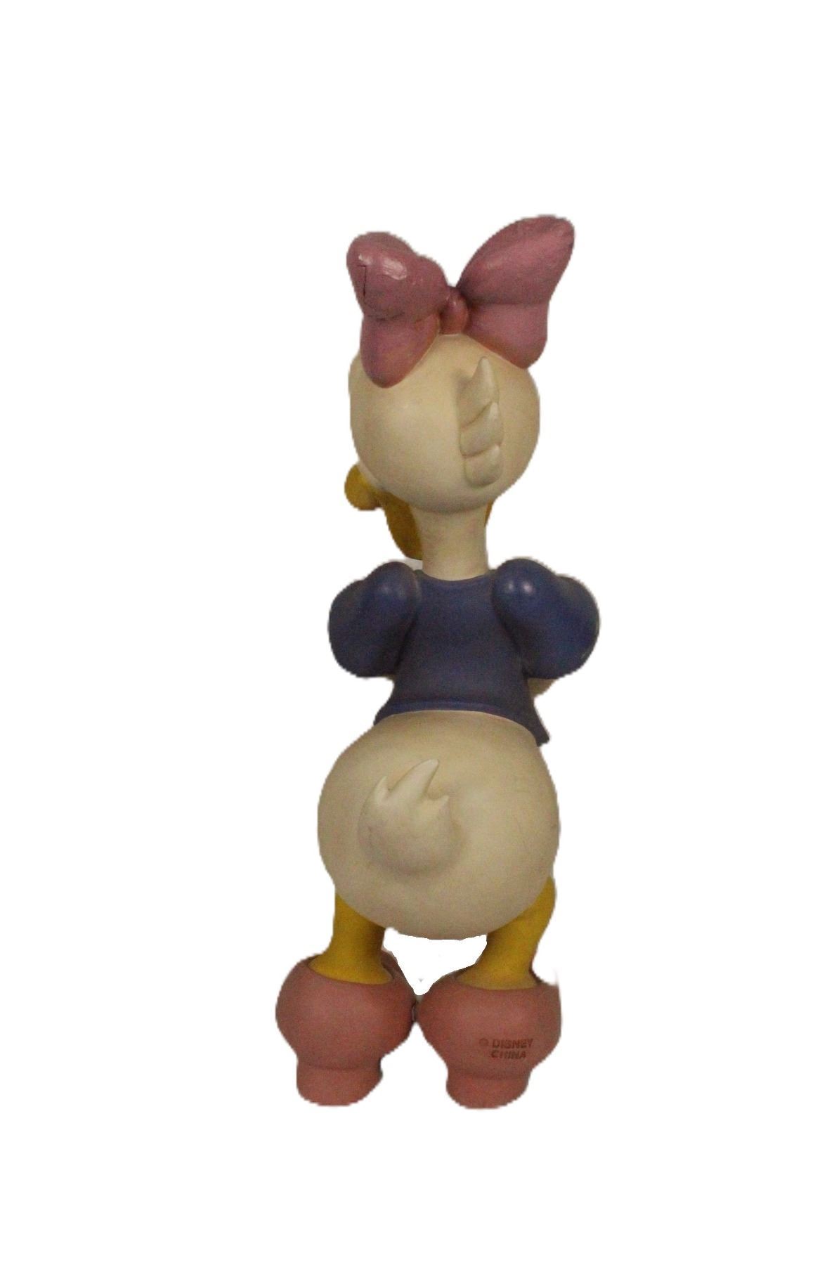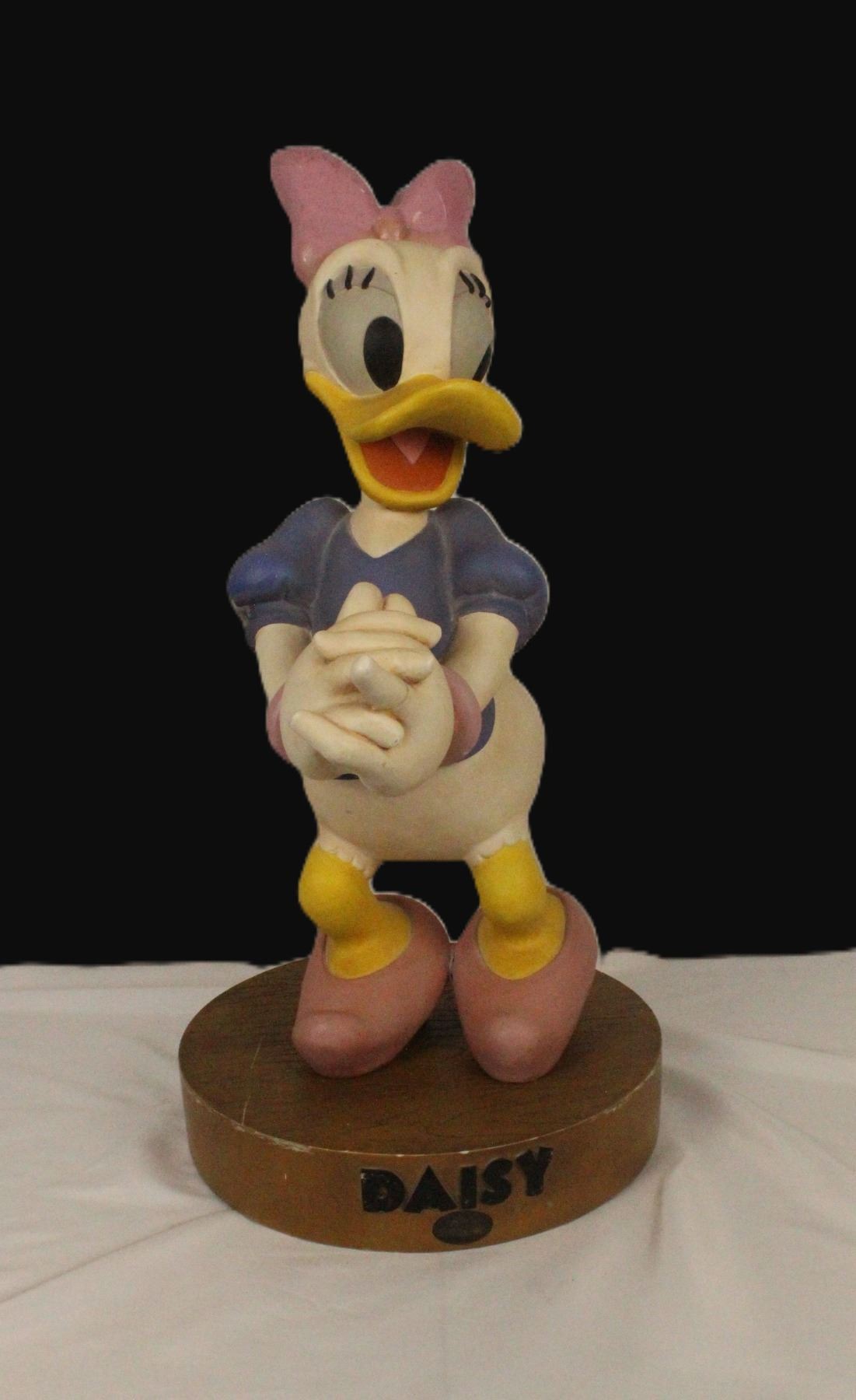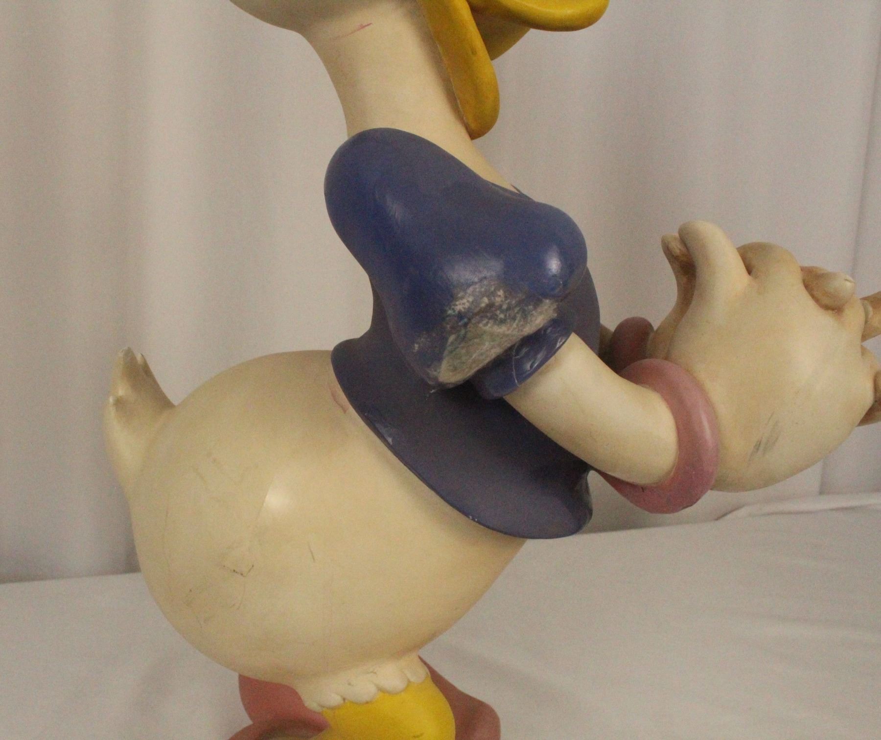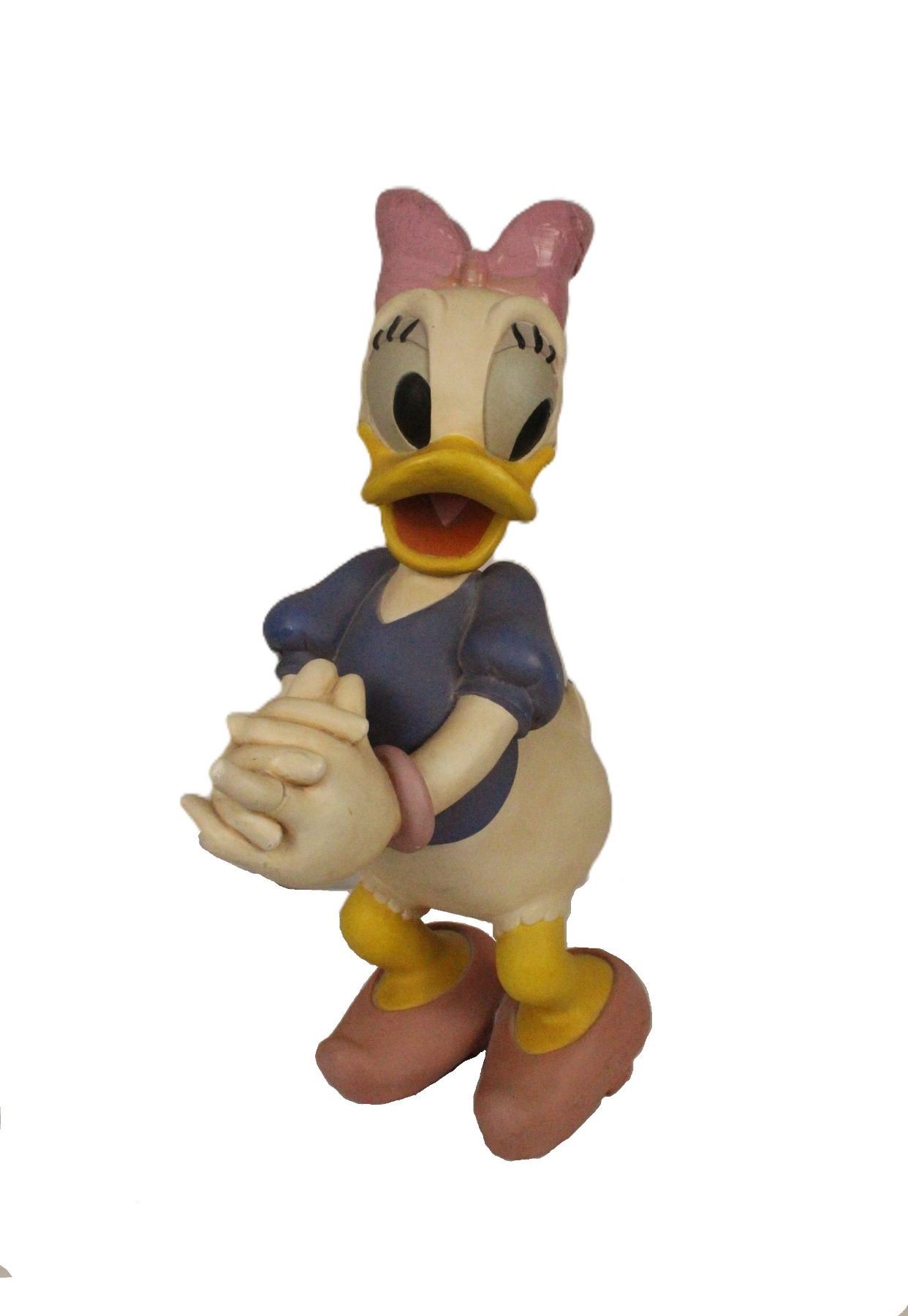 (Disney, 1989) An original first edition big fig of Daisy Duck. It is in less than fair condition with damage to the right sleeve, overall scuffing, a broken and re-glued finger, and damage and close matched paint applied to the bow. It measures almost 23” tall on it's stand.