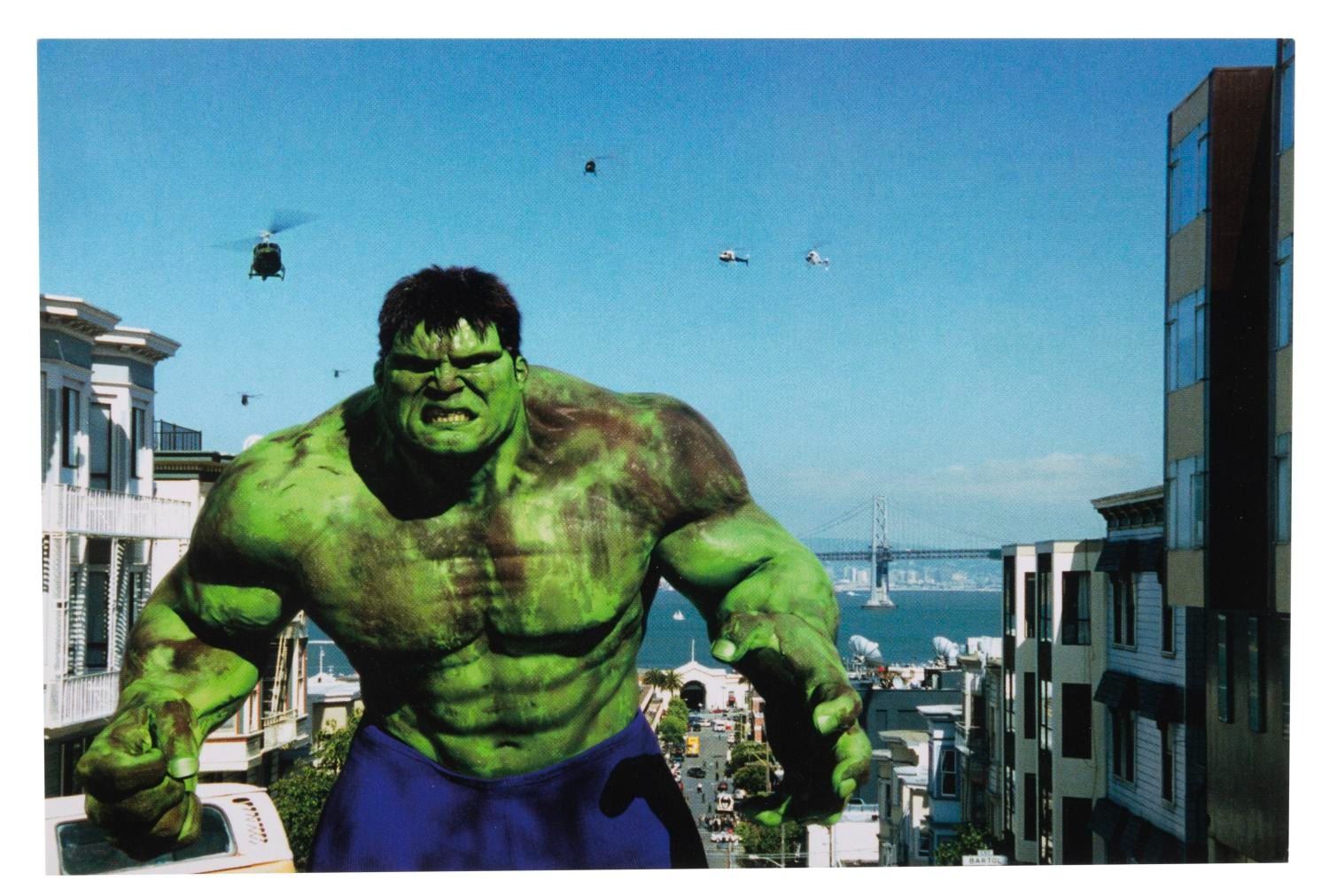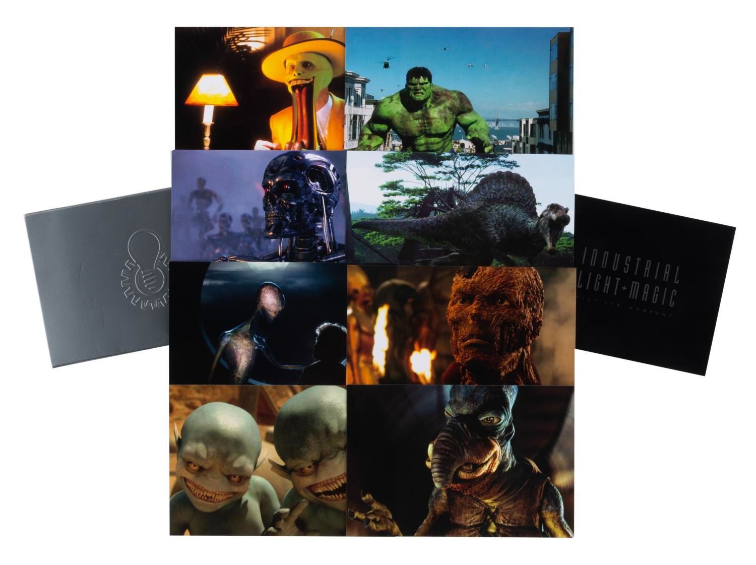 (Industrial Light & Magic, 2003-04) A rare promotional set of eight postcards highlighting film characters created digitally by Industrial Light and Magic. Films highlighted include “The Phantom Menace,” “The Mummy Returns,” “Galaxy Quest,” “Jurassic Park III,” “Terminator 3,” “The Mask,” and 2003’s “The Hulk.” Each card includes a behind-the-scenes insight into the effect, and the set includes a sleeve and logo cover card. Measuring 4” x 6”, the postcards are in very good condition with very light edge wear, and the sleeve is in good condition with small creases, scratches, and small spots of paper loss around the edge of the back.