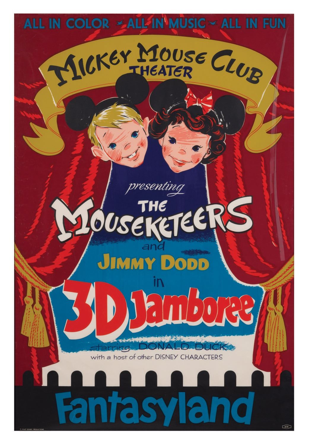 (Disneyland, 1956) An extremely rare original hand-silkscreened poster for the Mickey Mouse Club Theater - 3D Jamboree in Fantasyland. This popular show starred the Mouseketeers, Jimmy Dodd, Donald Duck, and classic Disney characters. Measuring 36"x54", the poster is in very good condition with a few mild creases and scuffs throughout and slight errors from the original silk-screen process.