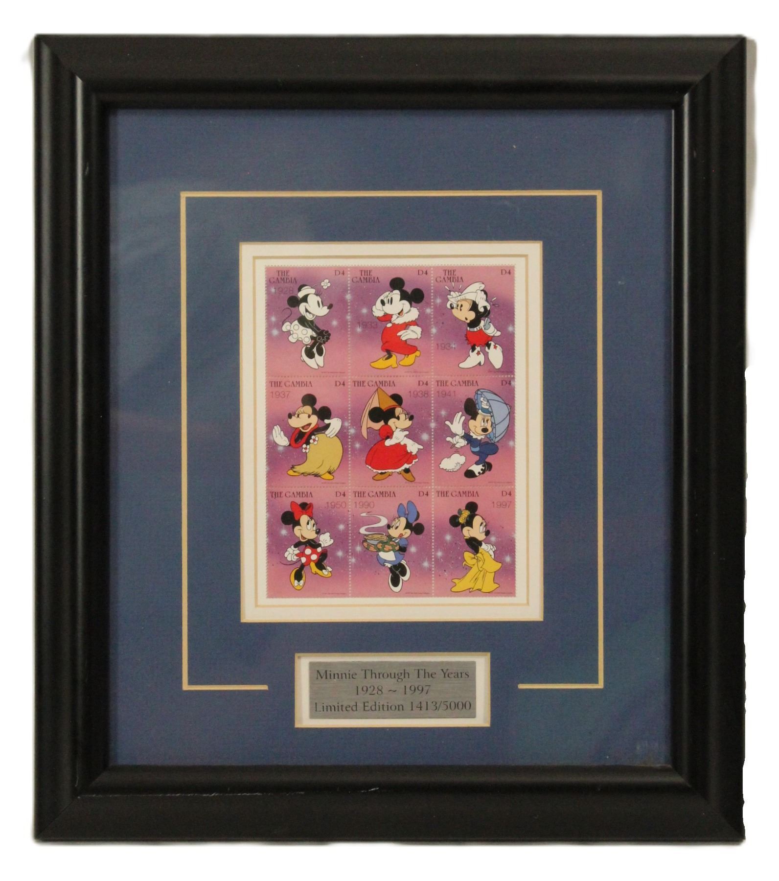(Disney, 1997) These Disney Limited Edition stamps are rare in availability as limited quantities were produced. This is #1413 of 5000 framed sets. This stamp is titled "Minnie Through The Years 1928 - 1997" was printed in Gambia. It is in very fine, like new condition and comes with a COA.
