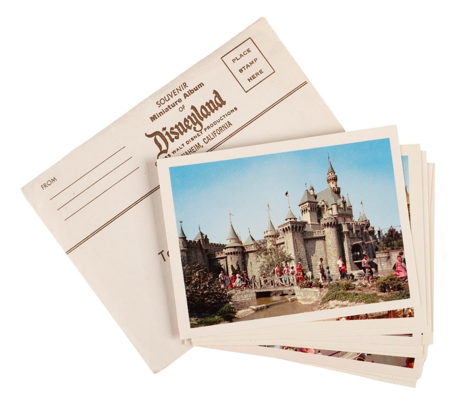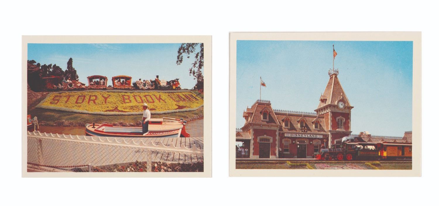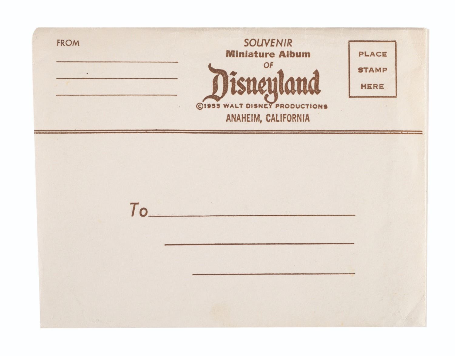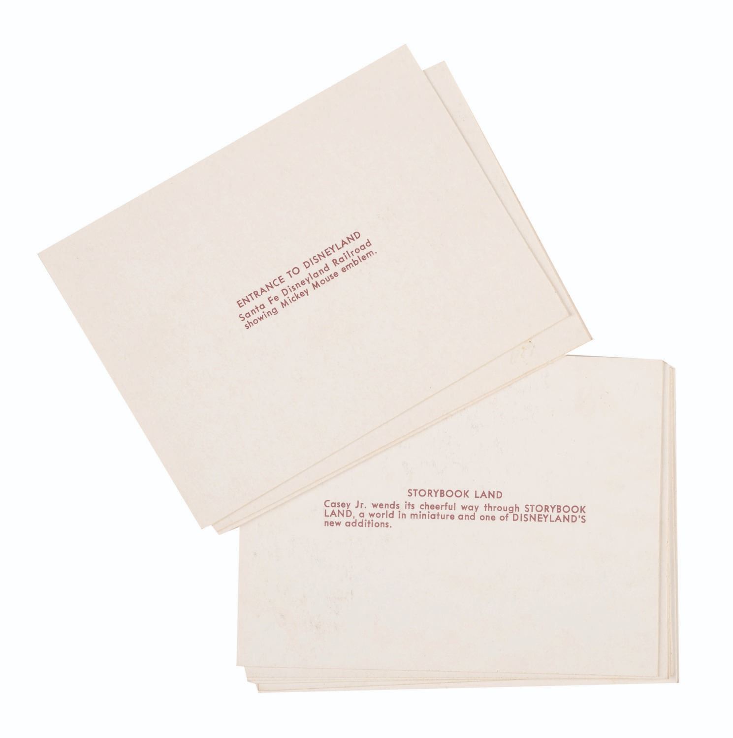(Disneyland, 1955) A rare set of misprinted souvenir miniature photos and envelope from Disneyland. Included among the scenes are Storybook Land, the original Skyway, Monsanto Hall of Chemistry, and more. Some of the cardbacks feature misprints of their descriptions. The 3.75" x 2.75" photos and the 4.75" x 3.5" envelope are in very good condition with minor wear.