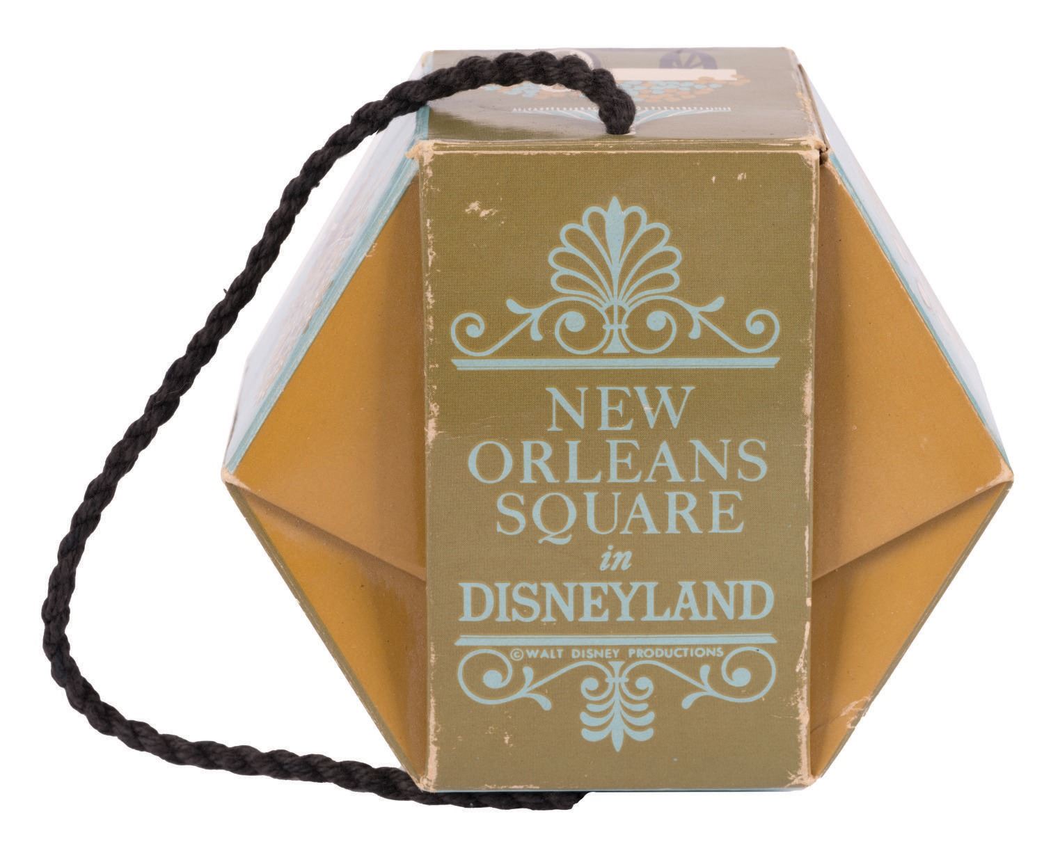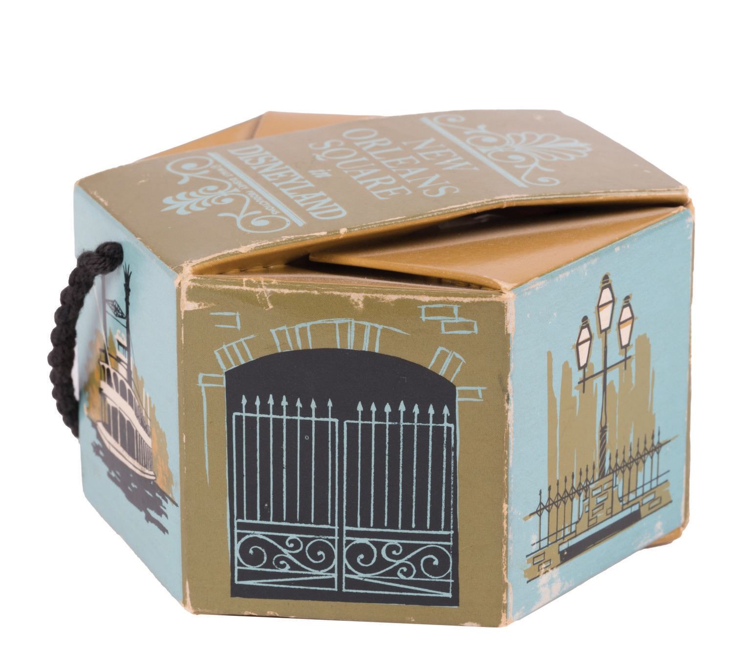 (Disneyland, 1960s-70s) A rare New Orleans Square Souvenir Box from Disneyland. This version of the box features three-color imagery of architectural character elements and the Mark Twain, with blue typeface of the New Orleans Square area logo, and cord strap. Measuring 4.5"x4" and 2.75", the cardstock box is in good overall condition with minor creases and wear from handling, and age.