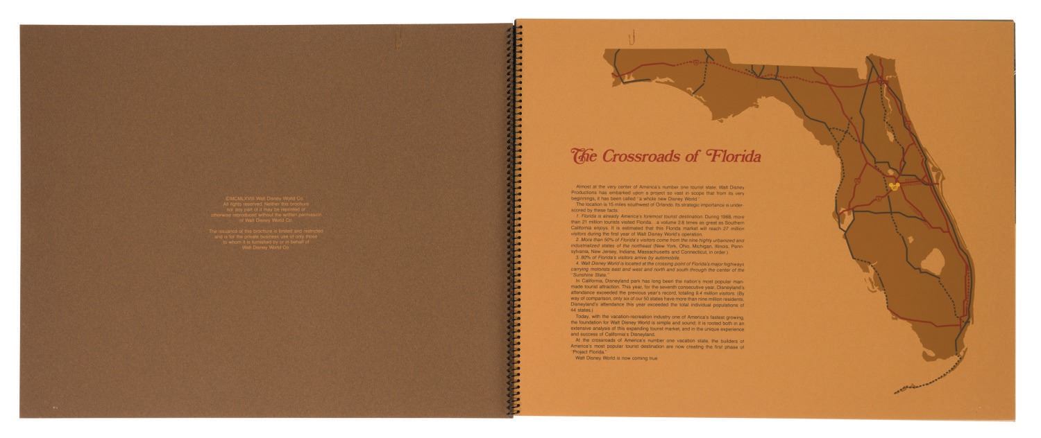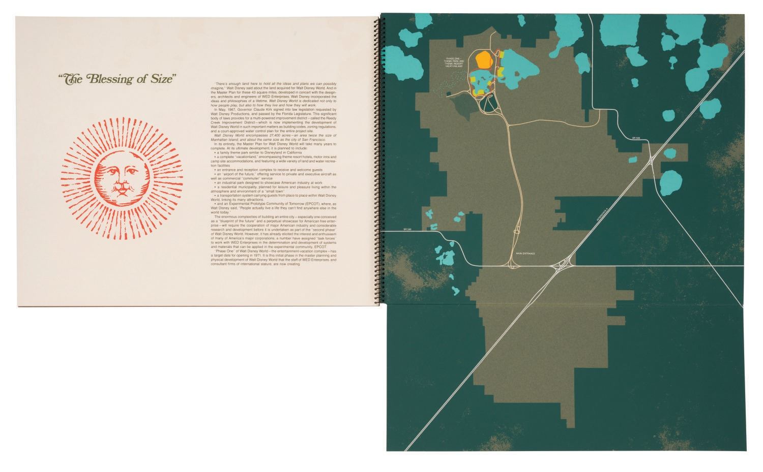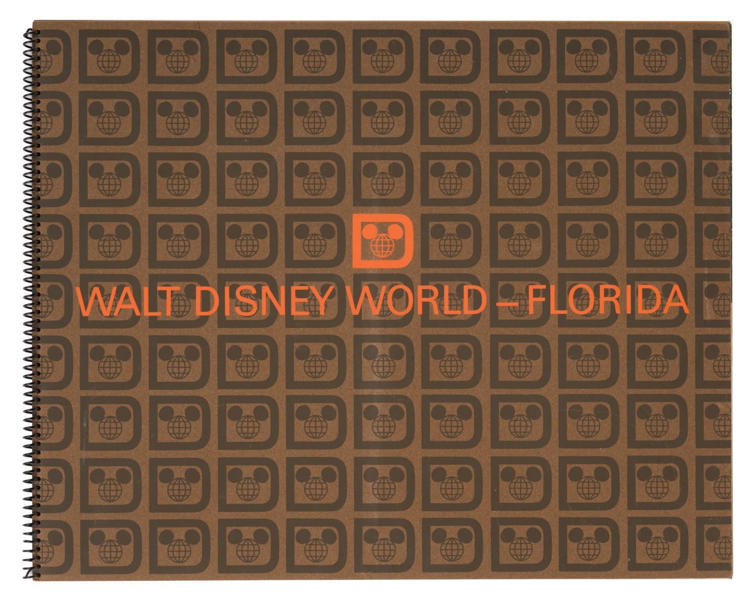 (Walt Disney World, 1967-68) An extremely rare, oversized presentation brochure for "Walt Disney World - Florida." The (21) pages detail Phase One for what was referred to as the "New Disneyland Park." The book notably depicts early color artwork of the Polynesian Resort, Contemporary Resort, and unbuilt Asian Resort. The pages also depict Thunder Mesa, a "200-foot-tall Space Mountain," and information related to the demographics of the Central Florida area. The entire piece was intended for presentation to local Florida government officials and potential Participant Sponsors of the Vacation Kingdom. Measuring 20.5"x16", the spiral-bound book is in very good condition with minor scuffs to the cover and little wear to the edges and corners of the pages.