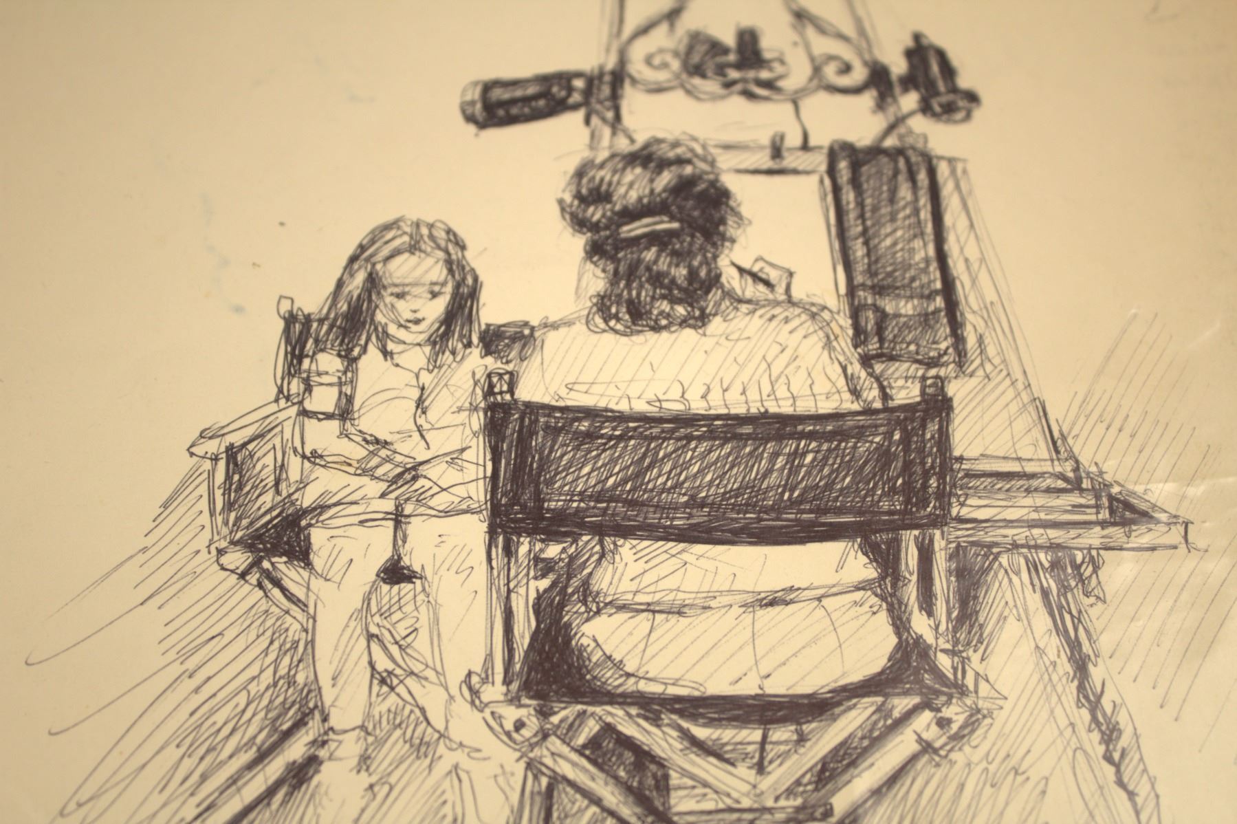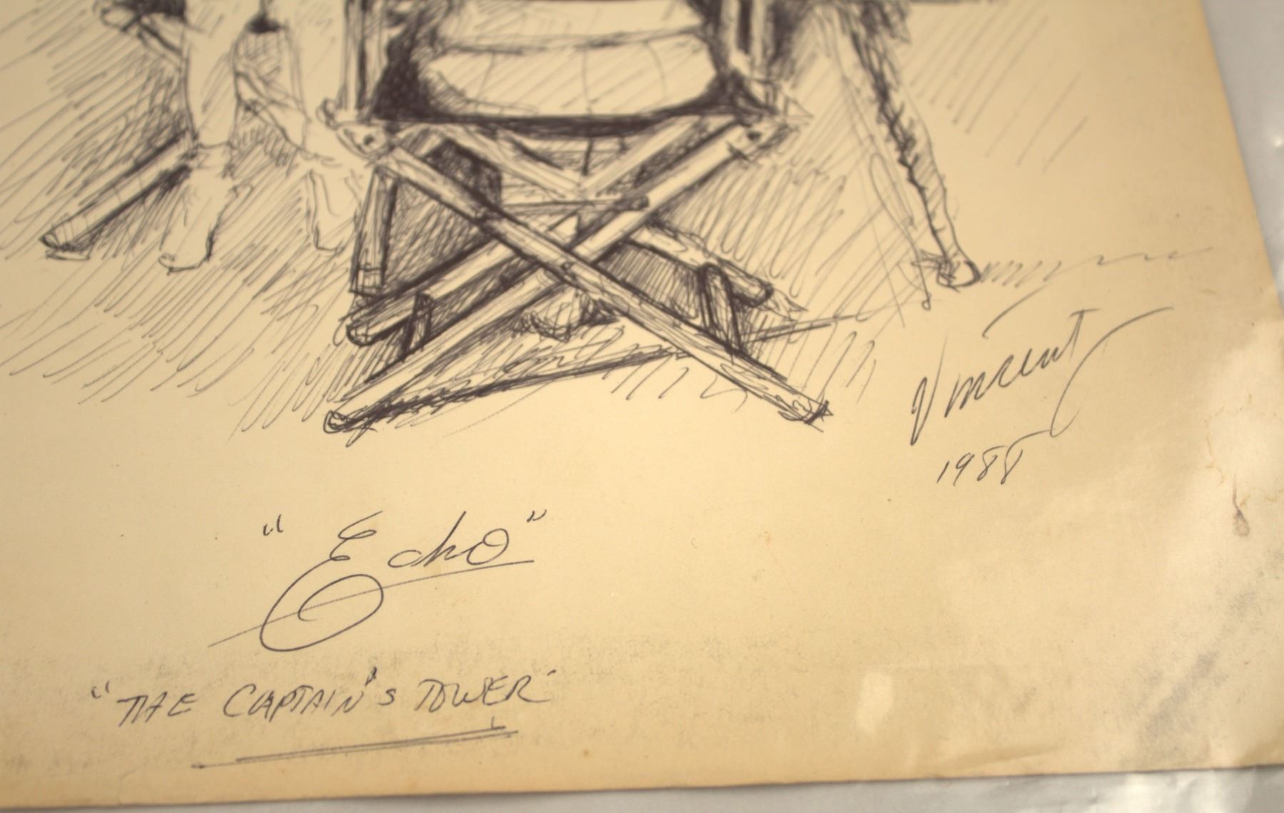This pen and paper drawing is titled "Echo""The Captain's Tower". The "Tower" was located at Walt Disney World Village, now called Disney Springs and was home to Caricature and Silhouette Artists. The art is drawn on official Walt Disney World Village paper belonging to Marvin Bennet. The image is of a female artist at work drawing a young girl. The title implies that this may be a self portrait of the female artist younger self or the artist's remembrance of a childhood experience. The title is at the bottom Center and Vincent 1988 is off to the right of the drawing. The backside of the drawing shows the partially drawn female profile, some drawing size calculations, the Walt Disney World Village logo, owner of the artist pad and location of Orlando, Fl.