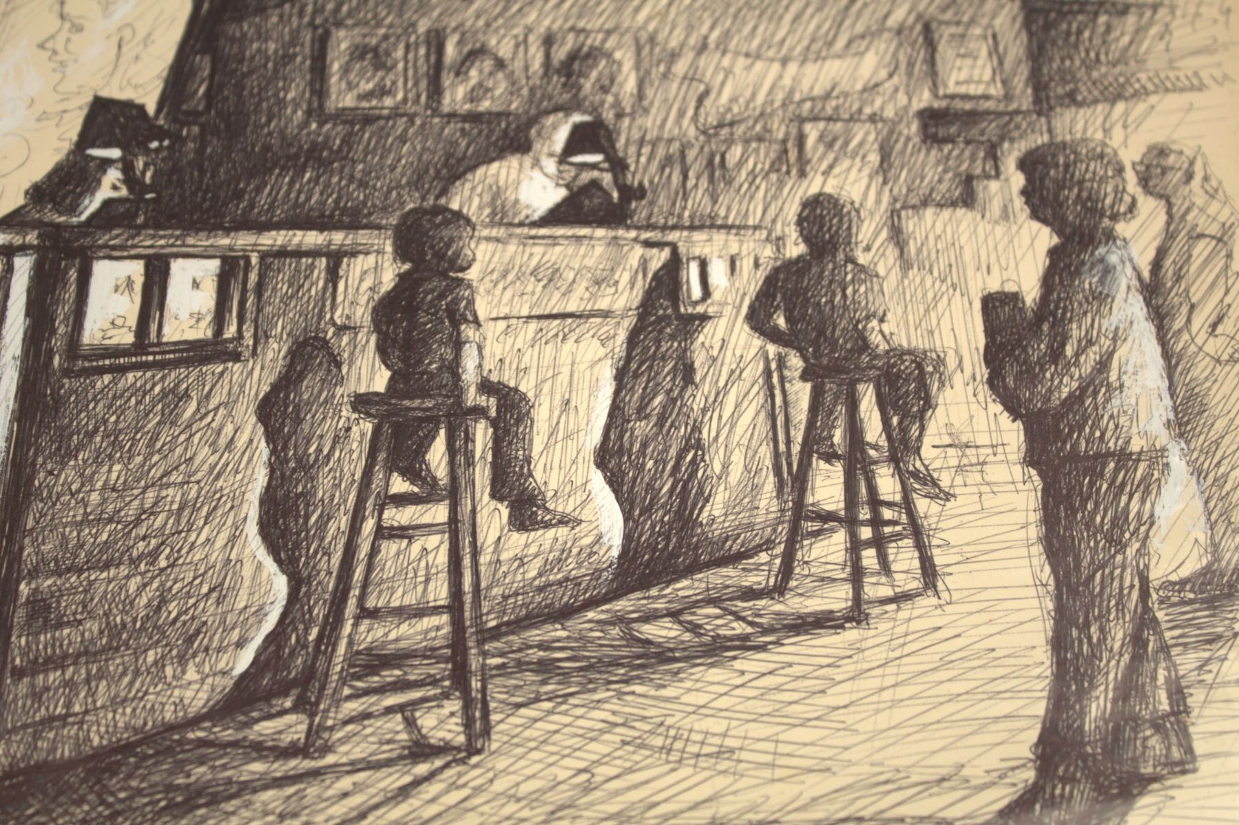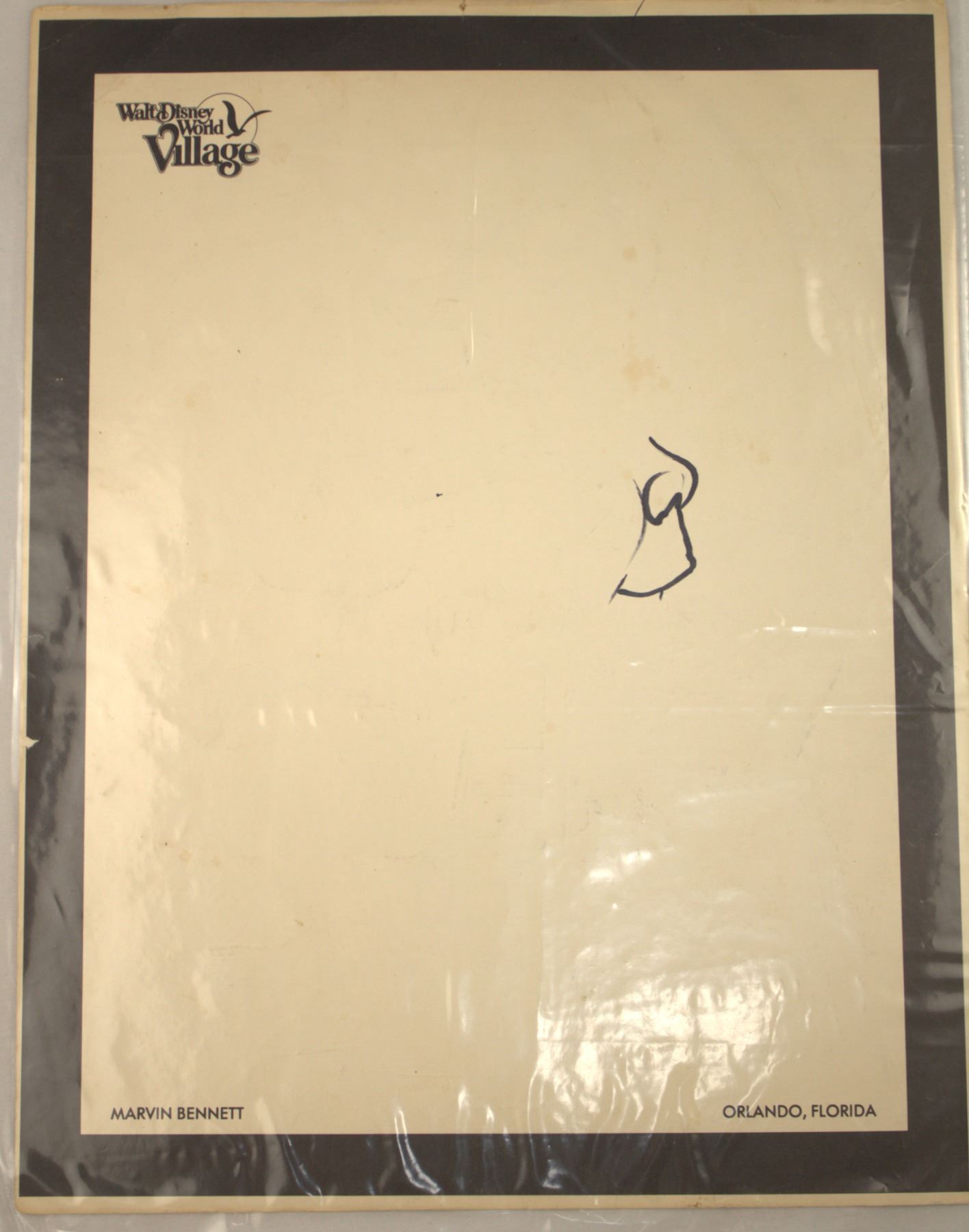 This pen and paper drawing is titled "Caricatures""The Tower at Night". The "Tower" was located at Walt Disney World Village, now called Disney Springs and was home to Caricature and Silhouette Artists. The art is drawn on official Walt Disney World Village paper belonging to Marvin Bennet. The image is of two artist at work drawing profiles of two children while two family members look on. The title and date of 1988 are in the bottom right of the image. Vincent Totera is the likely artist of this unsigned piece as it is from his estate and bears resemblance to his other drawings. The backside of the drawing shows the start of a caricature and the Walt Disney World Village logo, owner of the artist pad and location of Orlando, Fl.