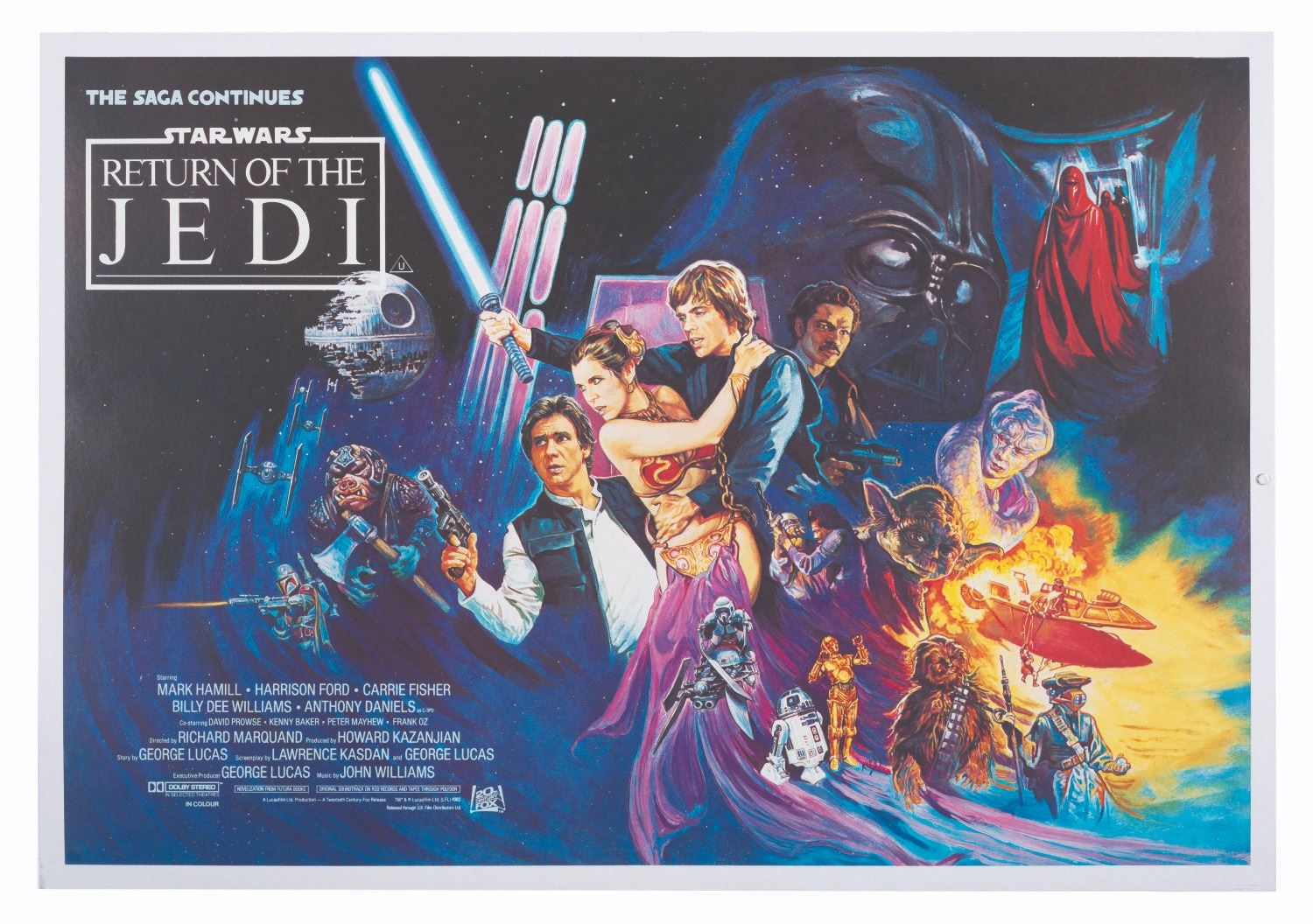 (LucasFilm Ltd., 1983) An extremely rare UK quad-sized poster for the British release of “Return of the Jedi,” designed by Josh Kirby. Unlike later posters, this early version does not feature the Ewoks. Measuring 27.5” x 40”, created for use within the London Underground, poster is linen-backed for preservation with a full size of 29.25” x 42”. The poster is in very good condition with light creases and marks at the bottom corners of the linen.