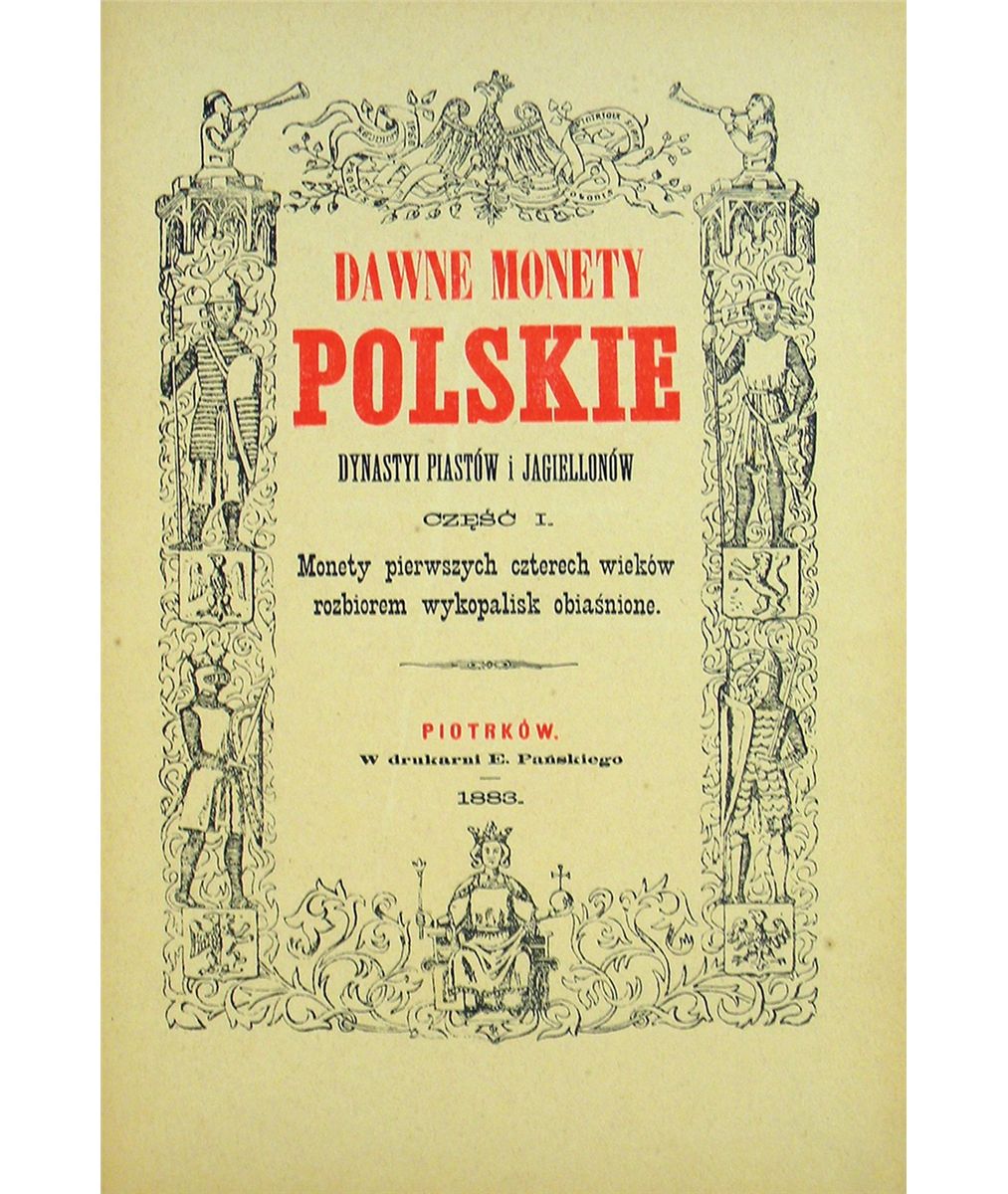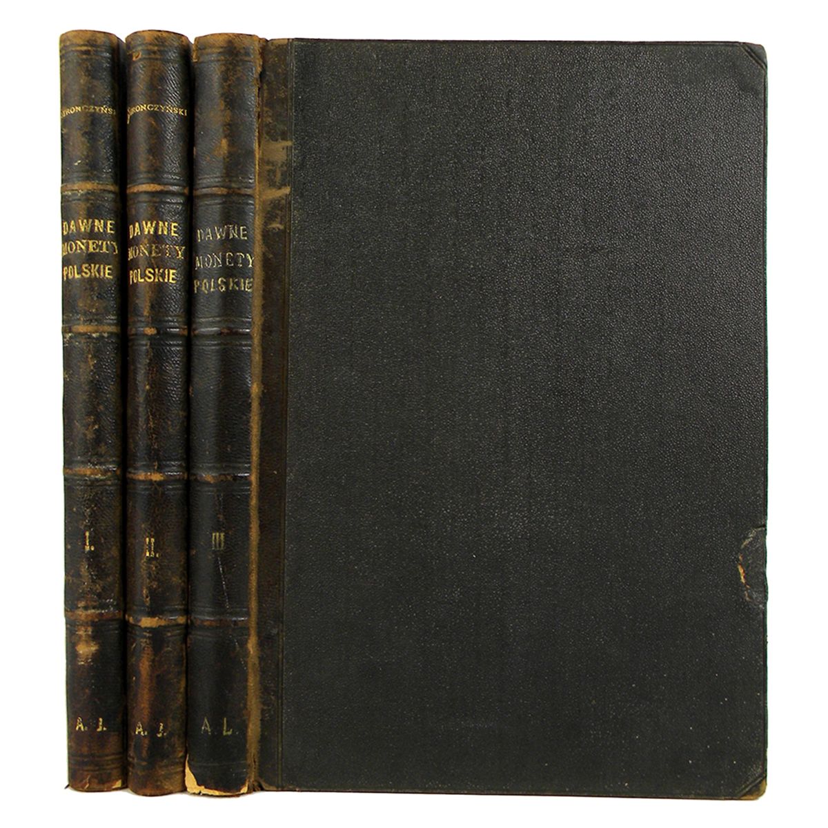 Stronczynski, Kazmirz. DAWNE MONETY POLSKIE, DYNASTYI PIASTÓW I JAGIELLONÓW. Piotrków: w drukarni E. Pańskiego, 1883–85. Three volumes, complete: Część I: Monety pierwszych czterech wieków rozbiorem wykopalisk obiaśnione. Piotrków, 1883. (8), 247, (1) pages; text illustrations; 11 lithographic plates of coins. Część II: Monety pierwszych czterech wieków w porządek chronologiczny ułożone i opisanie. Piotrków, 1884. (4), xvi, 221, 3 pages; text illustrations; 22 lithographic plates of coins. Część III: Monety XIV, XV i XVI wieku uporządkowane i objaśnione. Piotrków, 1885. (12), 244 pages; text illustrations; 13 lithographic plates of coins [numbered 23–35]. Small 4to, contemporary dark brown quarter morocco; spines with four raised bands, lettered in gilt [last volume lettered by hand]; original printed card covers bound in throughout; all page edges red. Titles printed in red and black within delightful historiated borders. Bindings a bit worn, but still a very good or better set with fine interiors. Rare and important. Wydanie w 400 exemplarzach. All three volumes signed by the author on title versos. Gumowski 2378. Herstal: “Elementarwerk m. Kritik von J. Polkowski.”