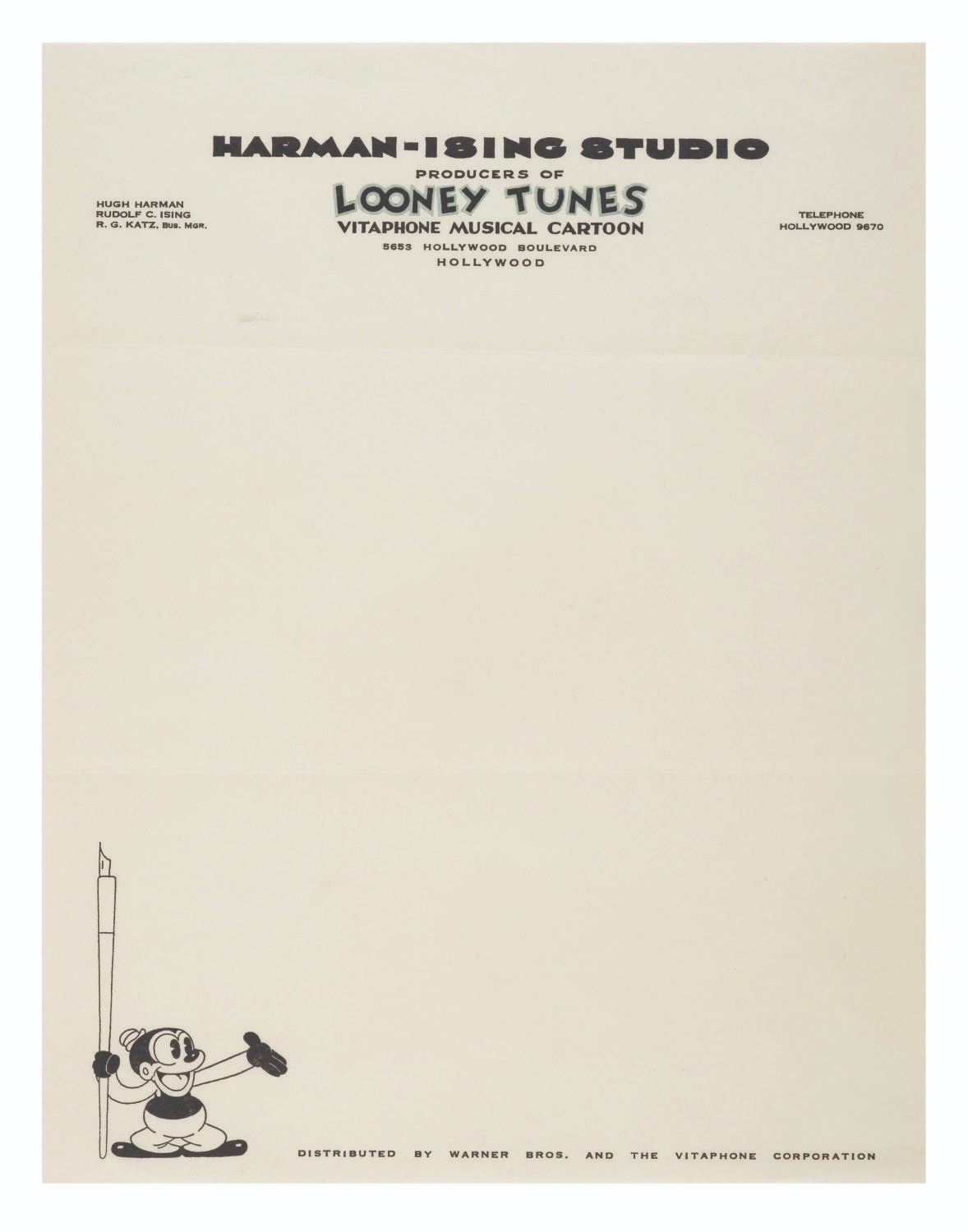 (Harman-Ising, 1930-33) A very rare sheet of Harman-Ising Studio stationery, from the period when they were producing Looney Tunes featuring Bosko. Ephemera such as this from the earliest days of animation is extremely rare, and it is a testament to Bob Clampett’s instincts as a collector that this survives in such pristine condition. Measuring 8.5” x 11”, this sheet of stationery is in fine condition, even with two horizontal creases from folding, and a faint smudge below the letterhead.
